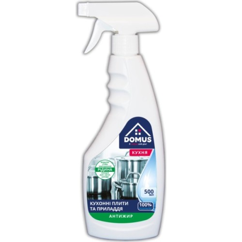 Засіб для видалення забруднень, жиру, кіптяви, нагару Domus швидко та ефективно видалить стійкі жирові забруднення, нашарування кіптяви та накипу з поверхонь кухонних плит, духовок, емальованих мийок, каструль та кахельних поверхонь.