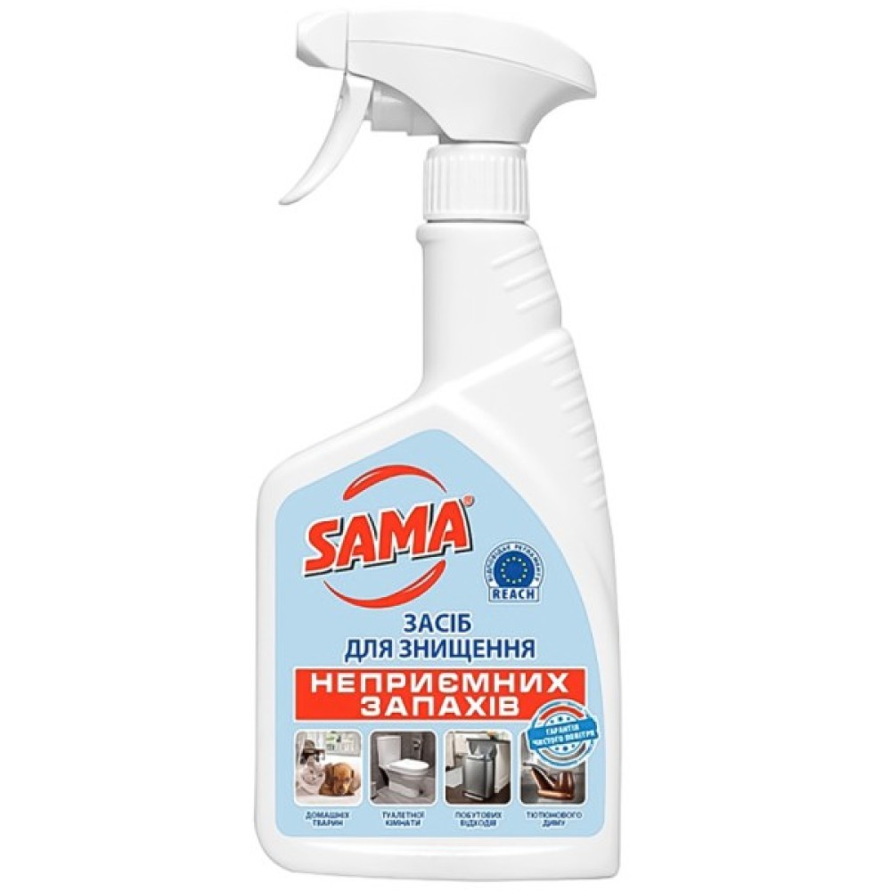 Засіб для знищення неприємних запахів SAMA – унікальний засіб, який знищує будь-які неприємні запахи та їхні джерела. Неперевершений результат досягається за рахунок їх знищення на молекулярному рівні. Знищувач запаху швидко і легко робить повітря чистим, залишаючи легкий приємний аромат. Найголовнішою перевагою цього засобу є те, що він не маскує, а знищує причину неприємного запаху. Призначений для нейтралізації запаху вогкості, тютюнового диму, запаху з туалетної кімнати та інших, знищення запаху сечі, фекалій, крові, блювотних мас, міток домашніх тварин.