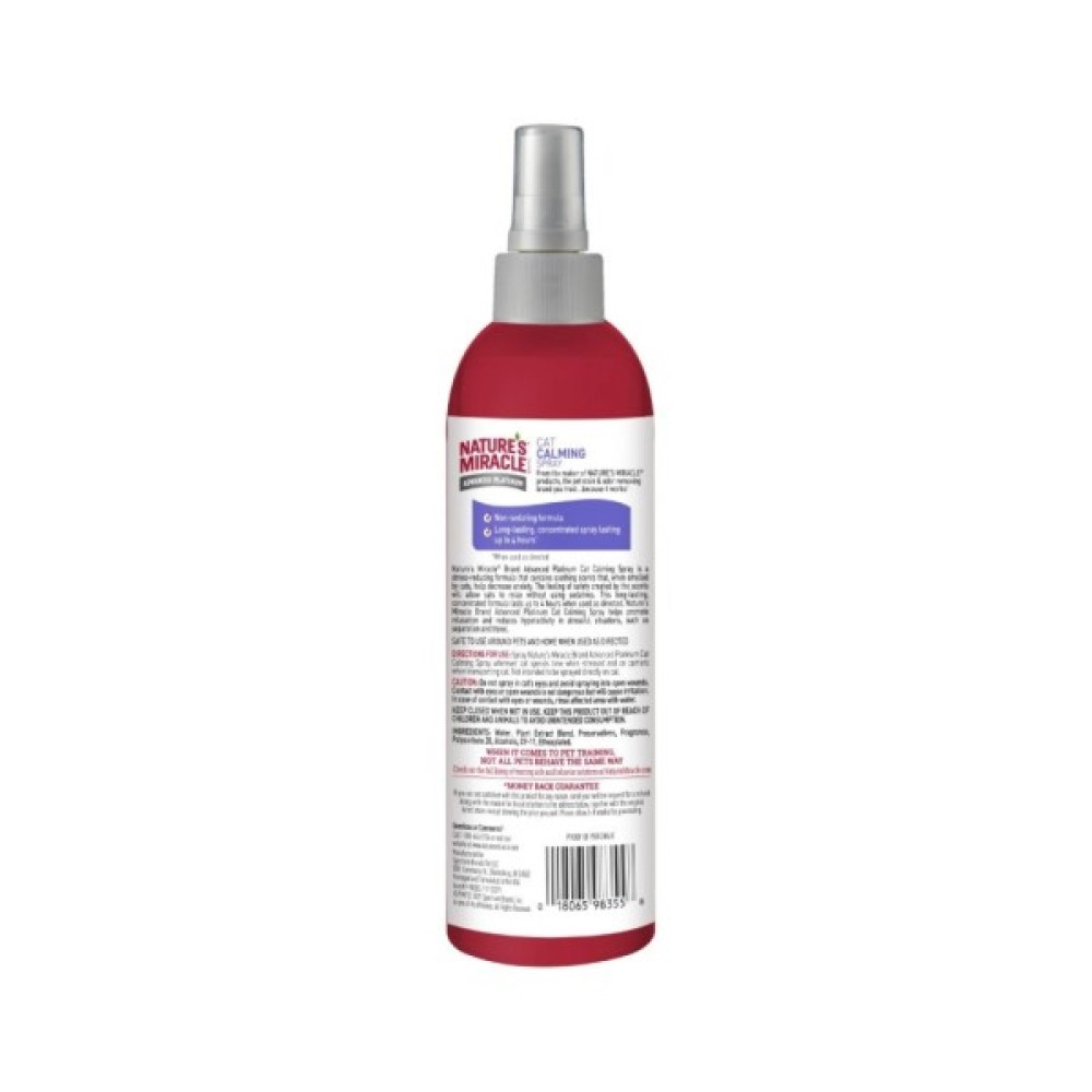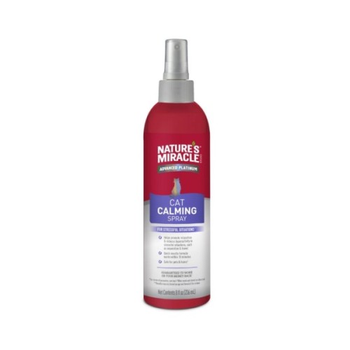 Nature's Miracle® Brand Advanced Platinum Cat Calming Spray – це формула для котів, яка зменшує стрес і містить заспокійливі аромати. Відчуття безпеки, навіяне ароматами, дозволить улюбленцям розслабитися без застосування заспокійливих засобів. Ця довготривала концентрована формула діє до 4 годин при використанні згідно з інструкцією. Заспокійливий спрей Nature's Miracle Brand Advanced Platinum Cat Calming Spray допомагає розслабитися та зменшує гіперактивність у стресових ситуаціях, таких як розлука та подорож.