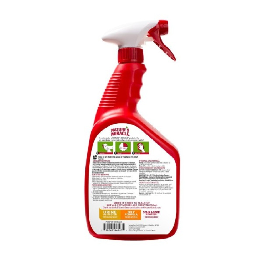 Знищувач плям і запахів з посиленою формулою для котів Nature’s Miracle справляється з найстійкішими забрудненнями, в тому числі і з тими, що в’їдаються та важко вивести. Спеціальна формула з біоензимами і активним киснем усуває найскладніші органічні плями та запахи, включаючи глибокі забруднення від трави, сигарет, корму, сечі, фекалій, крові і т. п. Можливості формули цього знищувача плям і запахів робить його найефективнішим продуктом в лінійці. Засіб може використовуватися для усунення плям та запахів, залишених котами та іншими тваринами на килимах, тканинах, твердих поверхнях, переносках і спальних місцях тварини.
