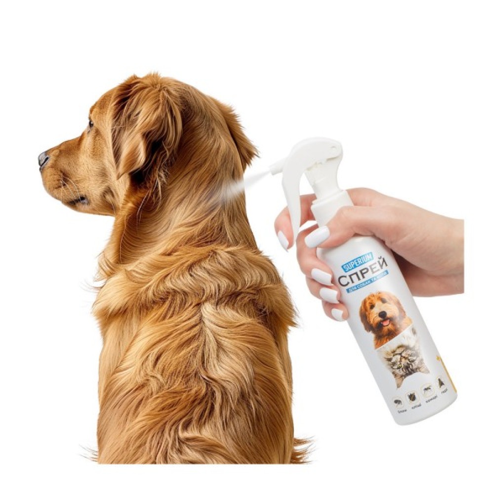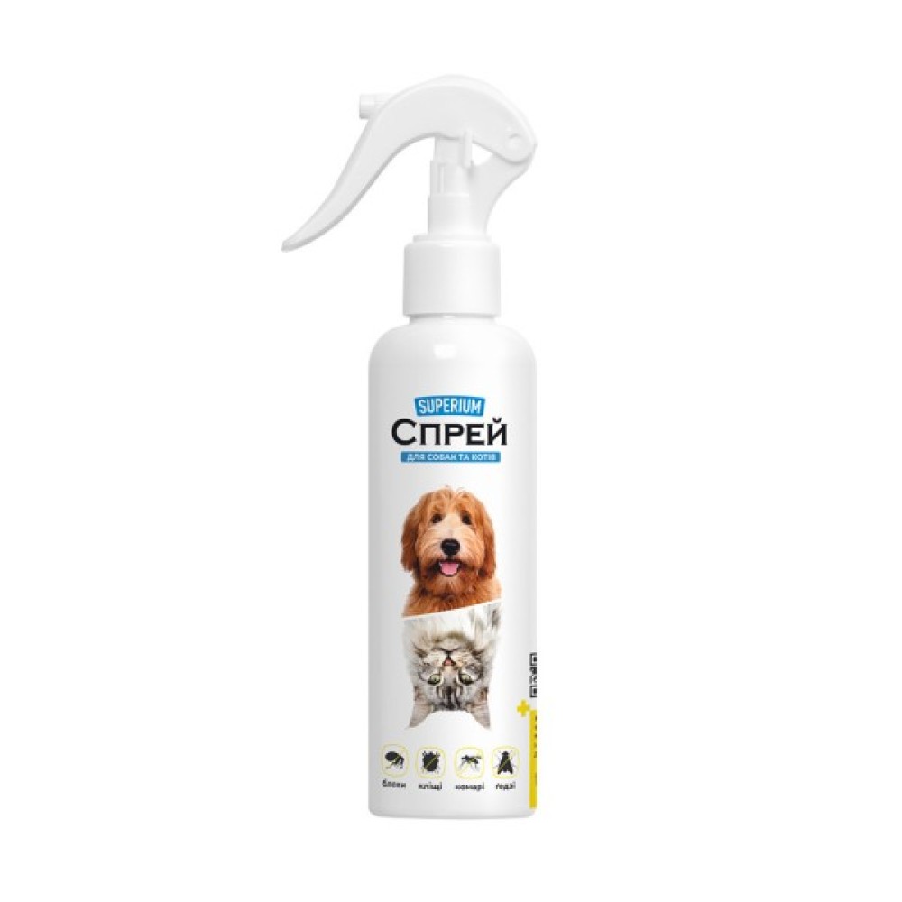 SUPERIUM Спрей призначений для лікування та профілактики при ураженні всіма видами ектопаразитів (кліщами, блохами, вошами, волосоїдами) та комахами (комарами, мухами, мошками, ґедзями), а також для лікування та профілактики блошиного алергічного дерматиту.