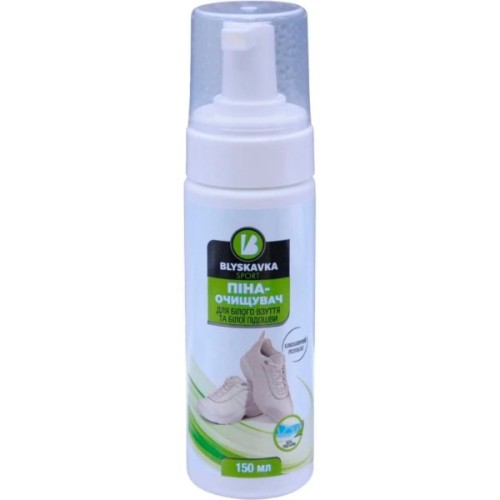 Будь-які забруднення особливо яскраво помітні на білому взутті. Щоб ефективно очистити його від вуличного бруду, використовуйте піну Blyskavka Sport для щоденного догляду. Засіб відмінно підходить для виробів з текстилю, нубуку, замші, шкіри та екошкіри. Піна-очищувач ефективно видаляє різні види забруднень з поверхні та підошви взуття, відновлює його первісний вигляд. Не використовуйте її на виробах з лайки та лакованої шкіри, кольорових речах.