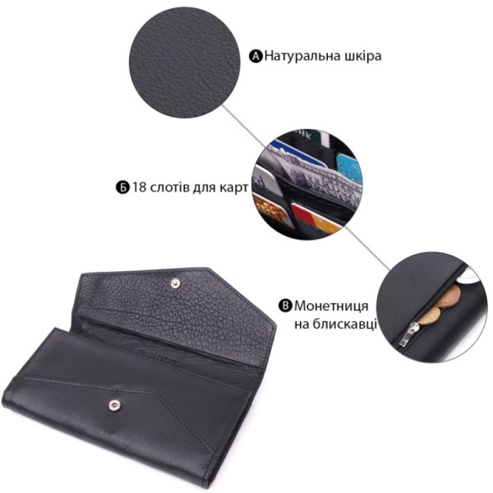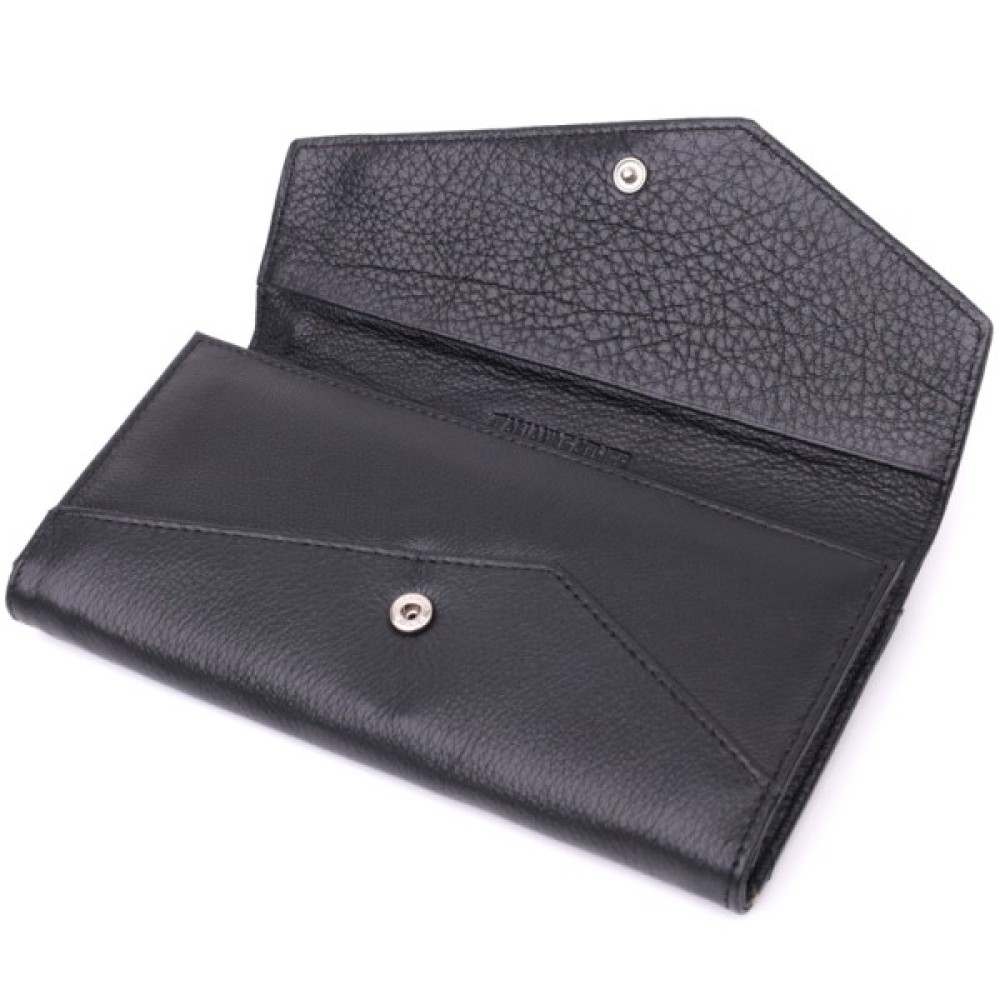 Зручне жіноче портмоне з незвичайним геометричним клапаном, що закривається на кнопку. Модель пошита з якісної шкіри, яка чудово проявила себе у довгостроковій експлуатації.