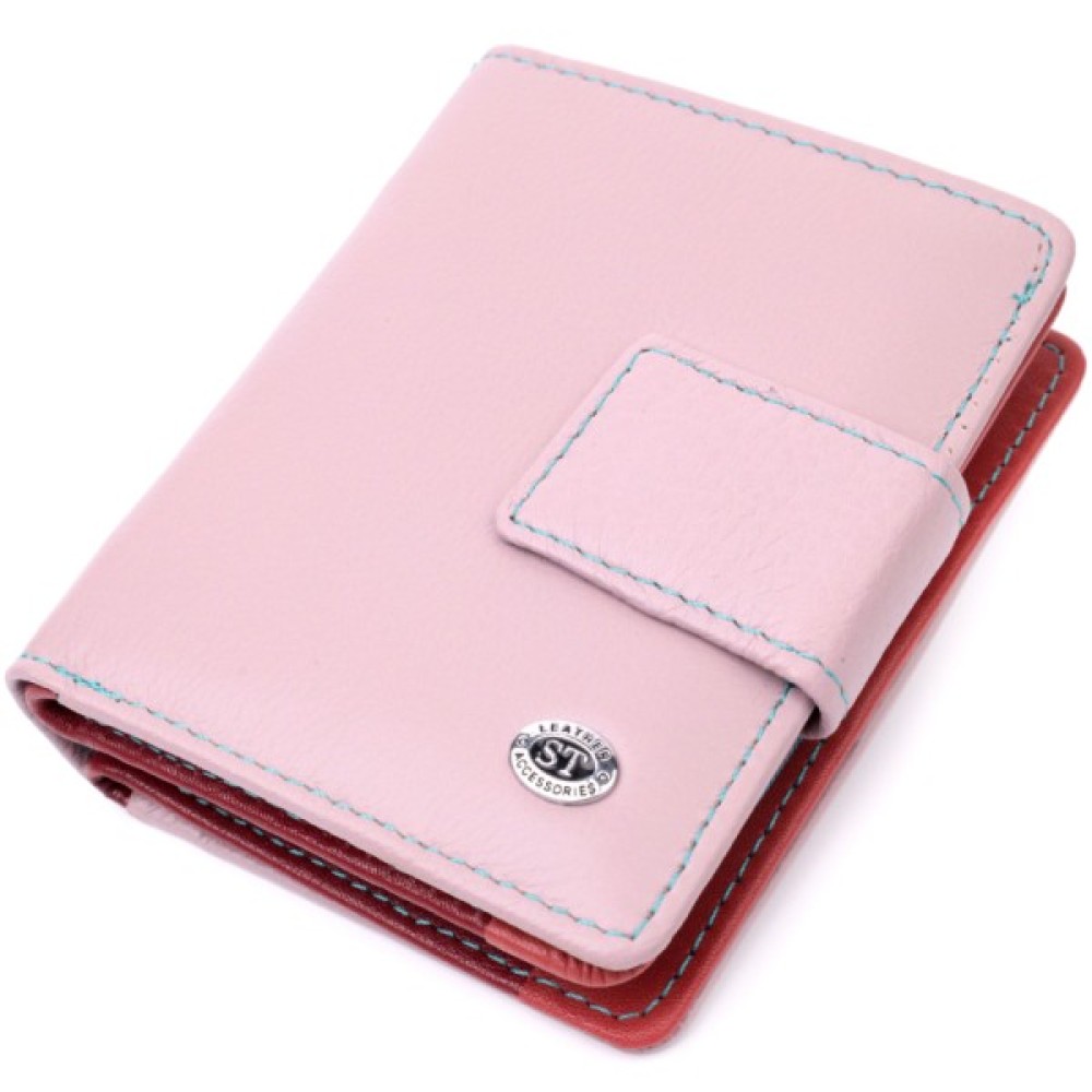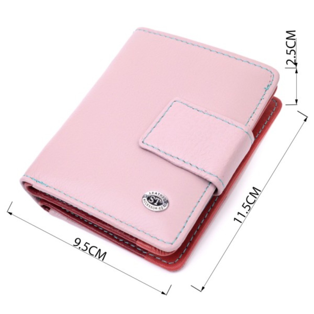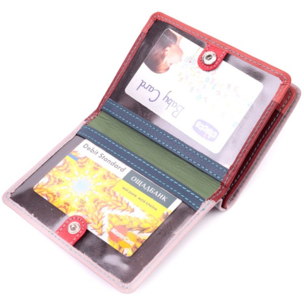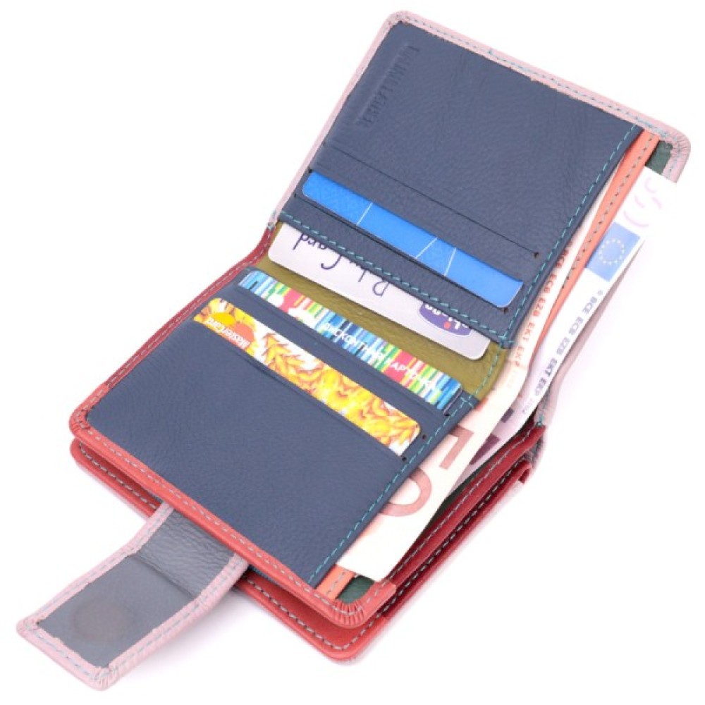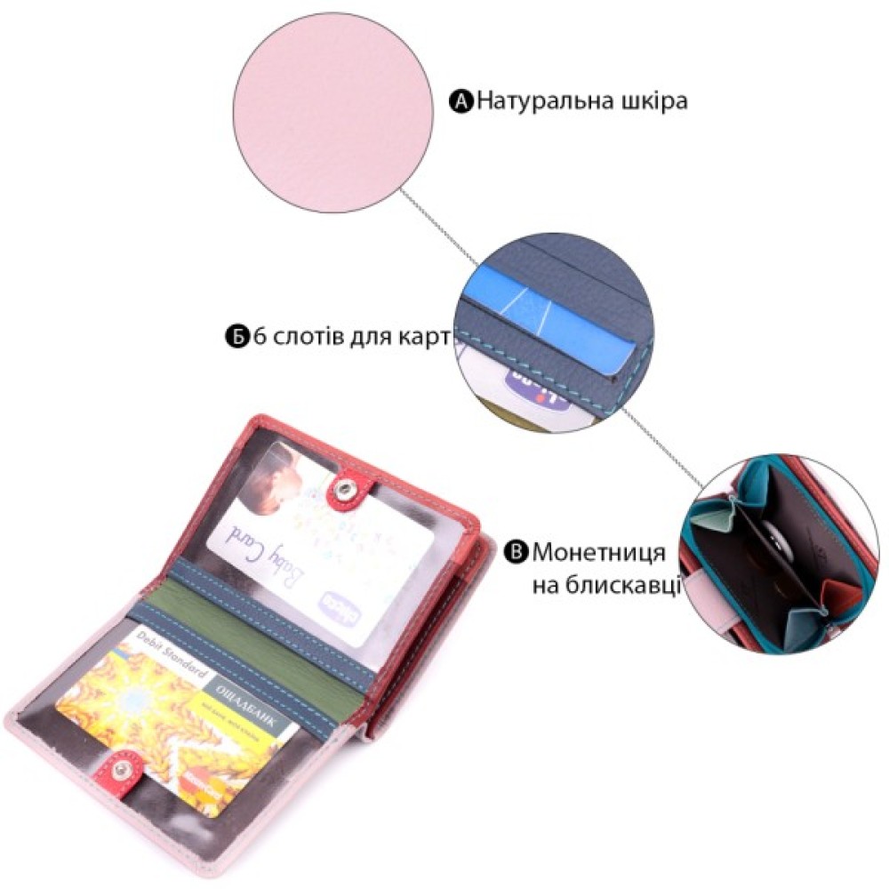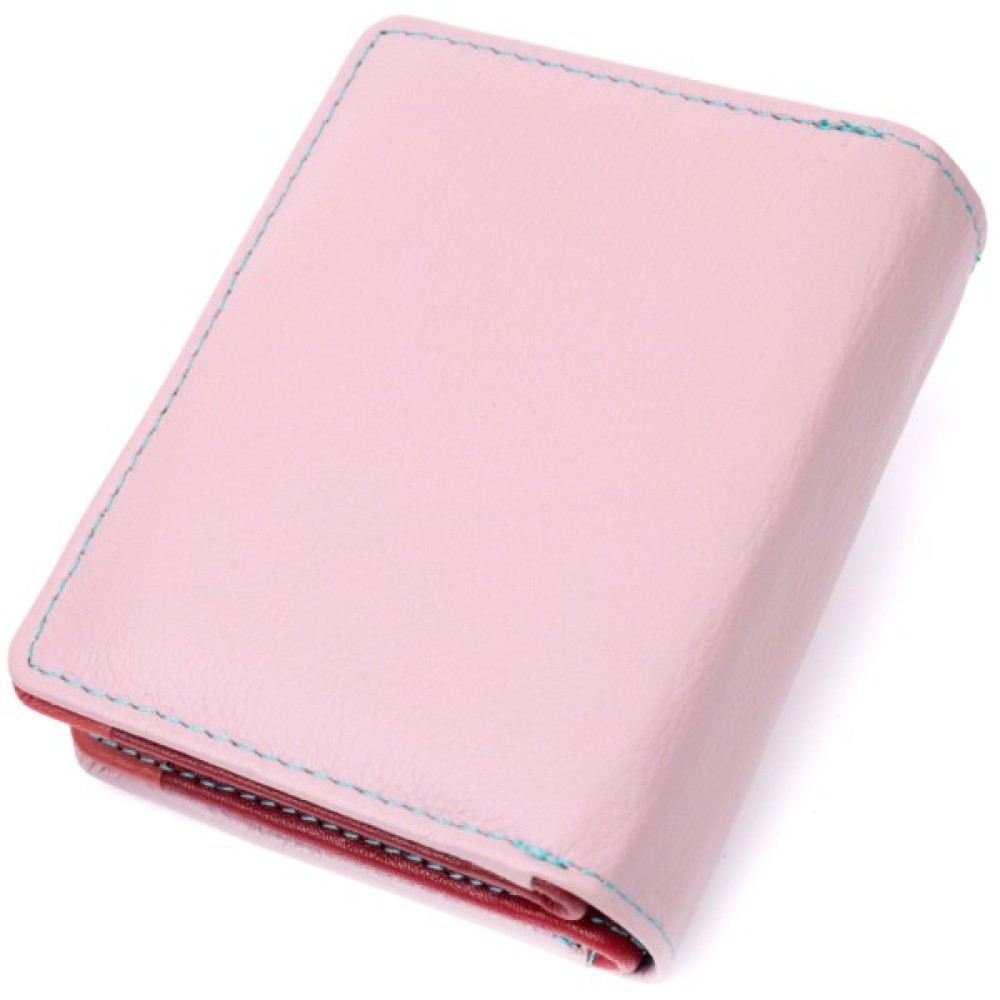 Відмінне портмоне в два складання компактного розміру з натуральної шкіри найвищої якості. Гаманець бежево-рожевого кольору зовні та різнобарвний усередині, що дуже стильно та сучасно. Шкіряне портмоне дуже практичне і служить досить довго. Аксесуар складається з двох містких кишень для купюр, кишені на блискавці для монет, шести осередків для карт, двох прозорих віконець для перепусток або фотографій та двох прихованих кишень. Портмоне доповнено надійною фурнітурою і прошито по краю рівним рядком бірюзового кольору. Виріб стане ідеальним подарунком для дівчини будь-якого віку.