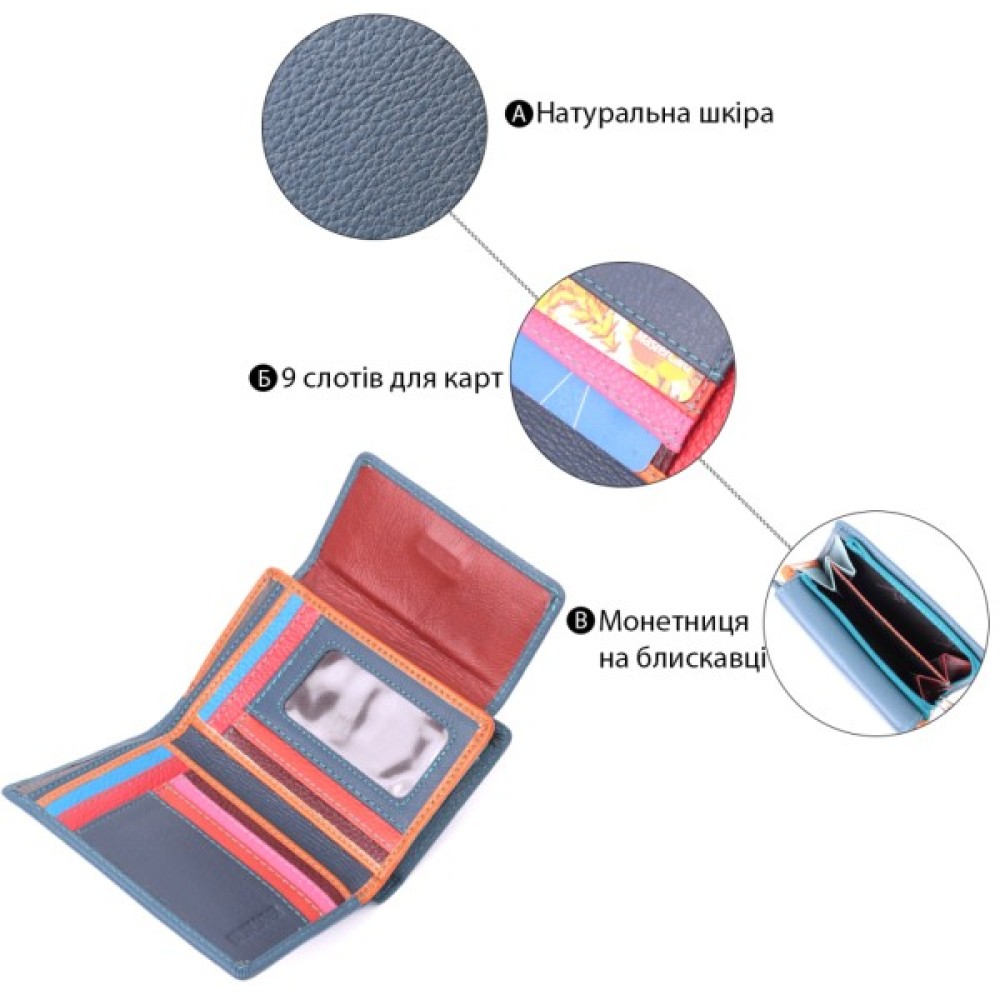Красивий жіночий гаманець подвійного додавання, що закривається на клапан з магнітом. Аксесуар виконаний з якісної натуральної шкіри, яка чудово носиться і не втрачає свого первісного вигляду з роками. Відмінна риса цієї моделі в яскравому внутрішньому забарвленні. Усередині є два відділення для купюр, дев'ять слотів для пластикових карток, дві приховані кишені та одна монетниця, що закривається на блискавку. Ідеальний аксесуар для любительок гаманців середнього розміру та практичного функціоналу.