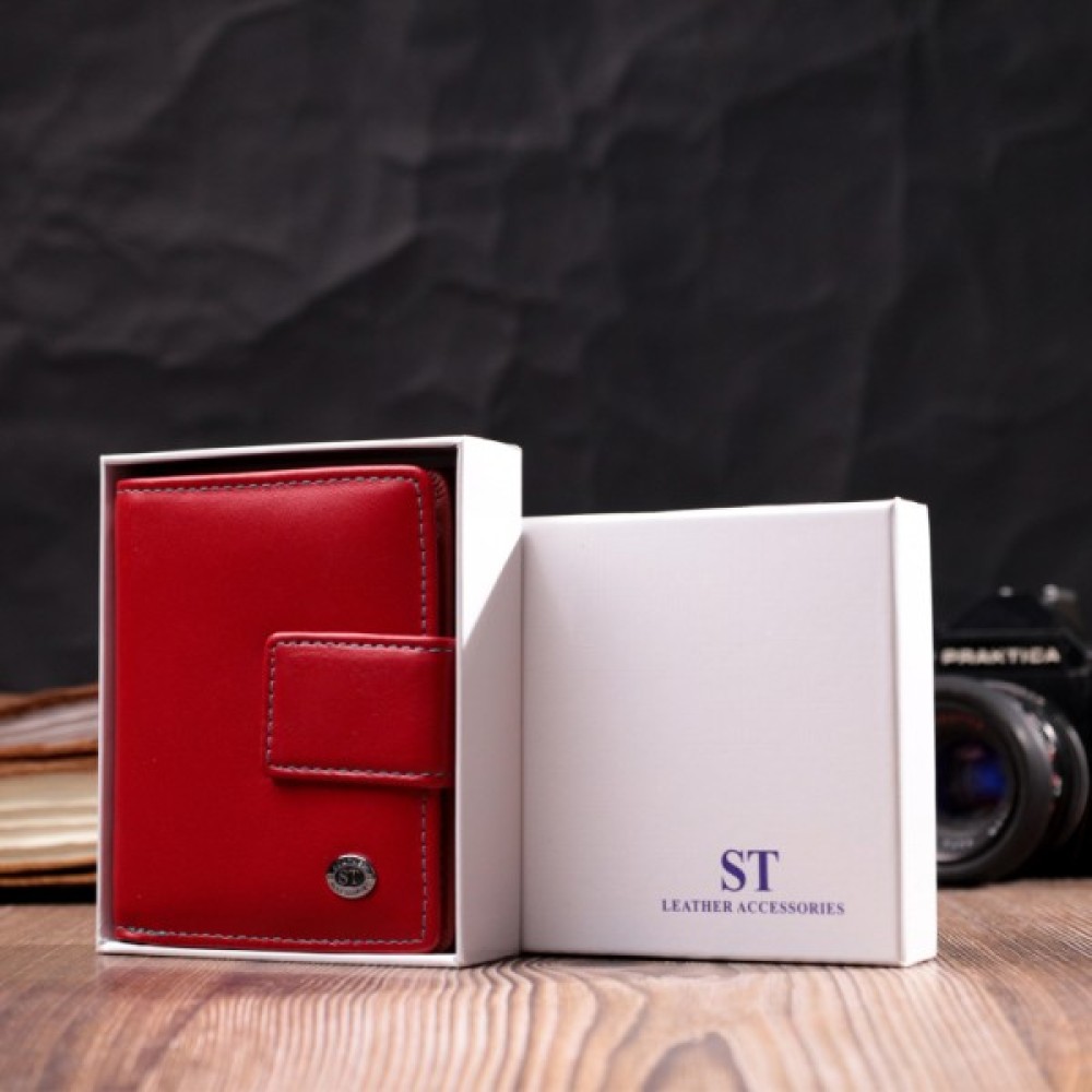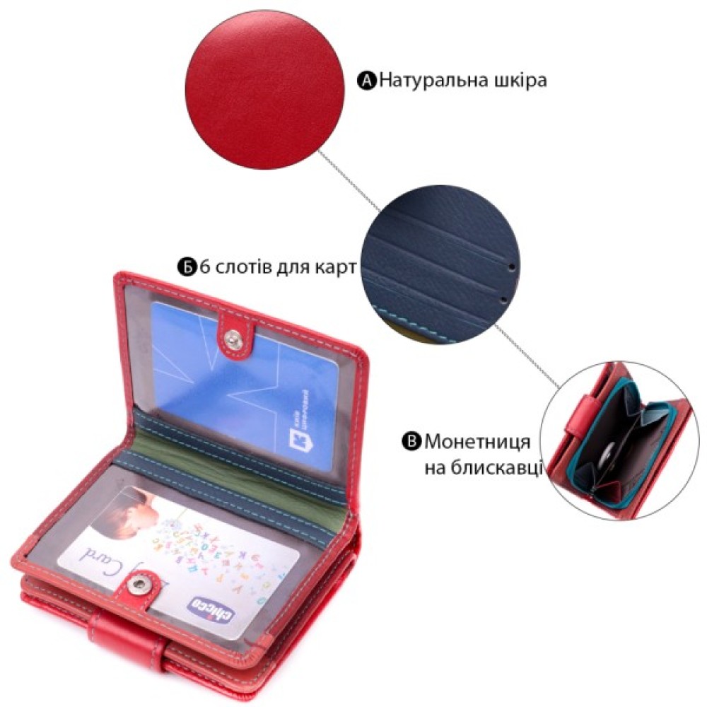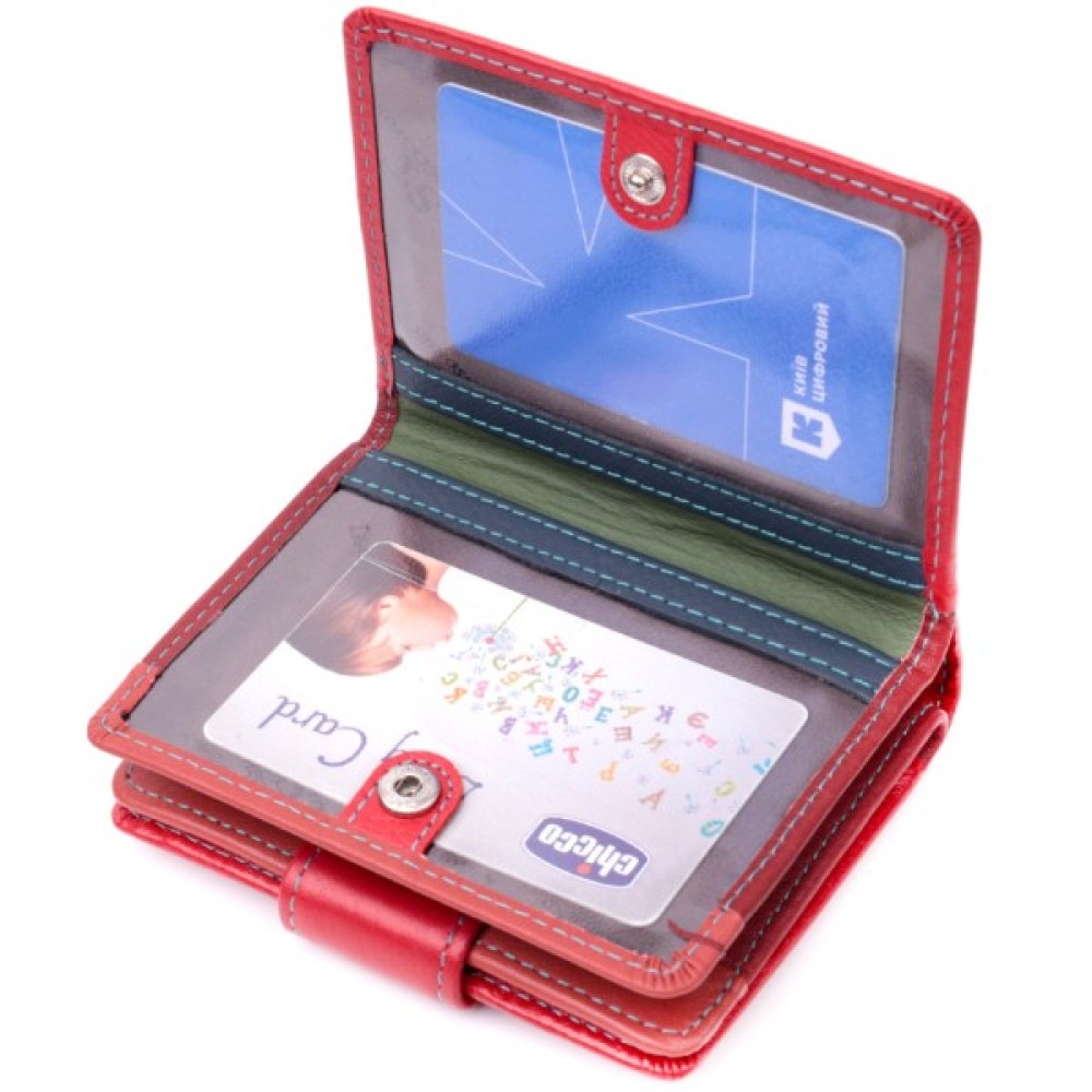 Гаманець червоного кольору зовні та різнобарвний усередині, що виглядає стильно та сучасно.