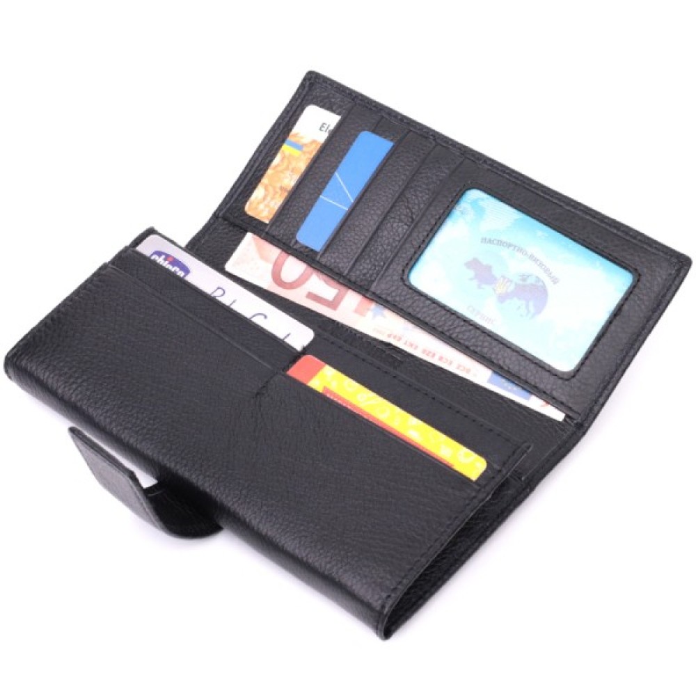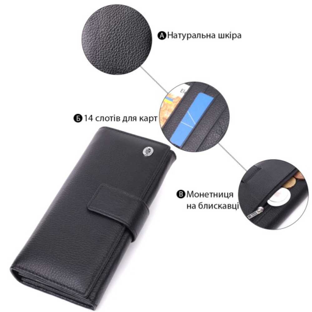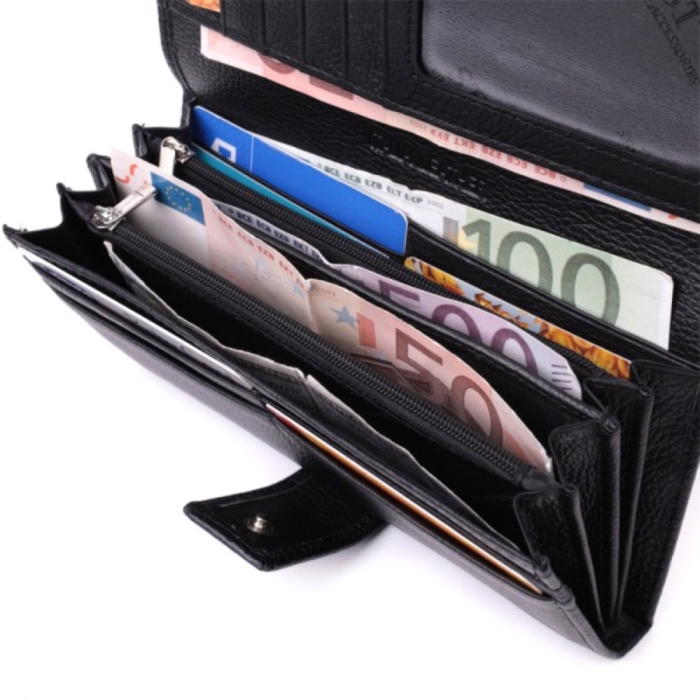 Модне жіноче портмоне вертикального типу, що закривається навпіл хлястиком на кнопку. Модель пошита з якісної шкіри, яка чудово проявила себе у довгостроковій експлуатації. Аксесуар складається з чотирьох відділень для купюр, двох кишень на блискавці, чотирнадцяти осередків для пластикових карток, двох прилеглих кишень та монетниці зовні.