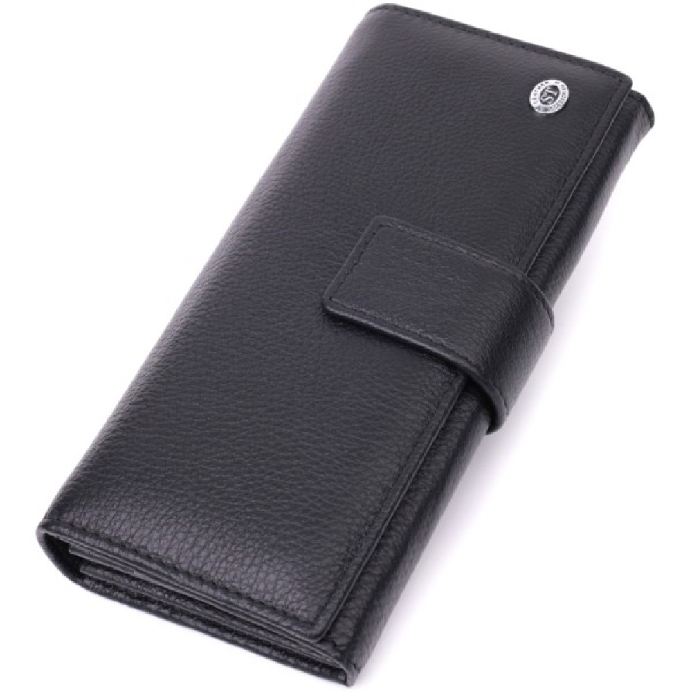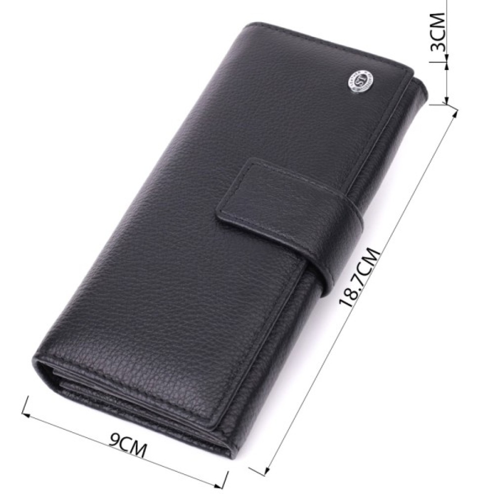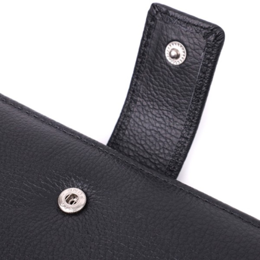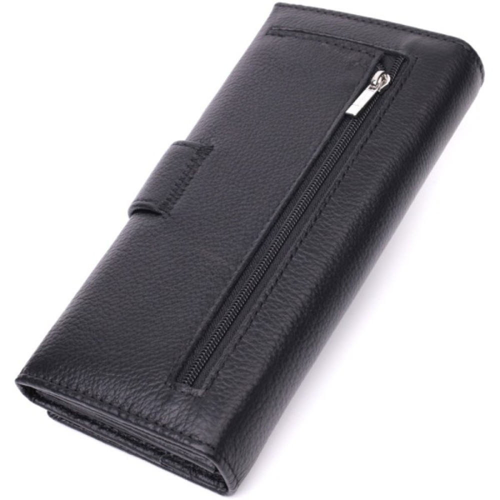 Модне жіноче портмоне вертикального типу, що закривається навпіл хлястиком на кнопку. Модель пошита з якісної шкіри, яка чудово проявила себе у довгостроковій експлуатації. Аксесуар складається з чотирьох відділень для купюр, двох кишень на блискавці, чотирнадцяти осередків для пластикових карток, двох прилеглих кишень та монетниці зовні.