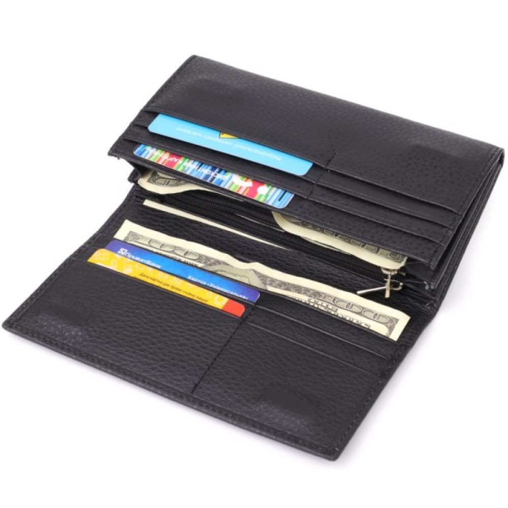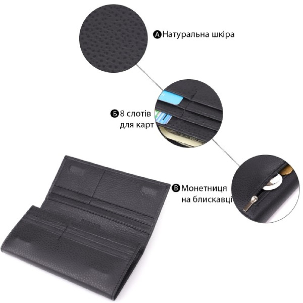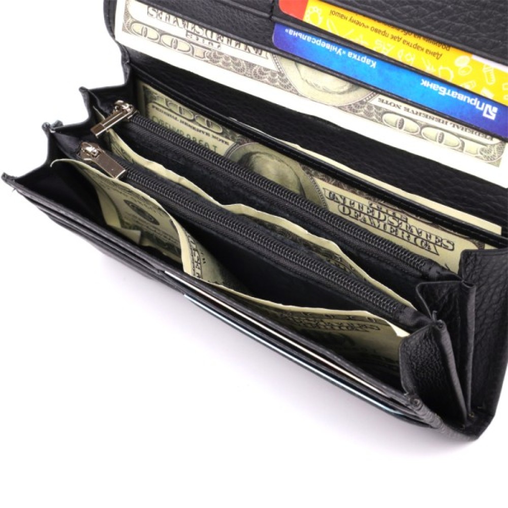 Місткий жіночий гаманець для тих, хто цінує якість та практичність. Аксесуар виготовлений з добротної натуральної шкіри і містить три відділення для купюр, дві кишені на блискавці, кишеню під плівкою, вісім слотів для карток, дві приховані кишені та зовнішню монетницю.