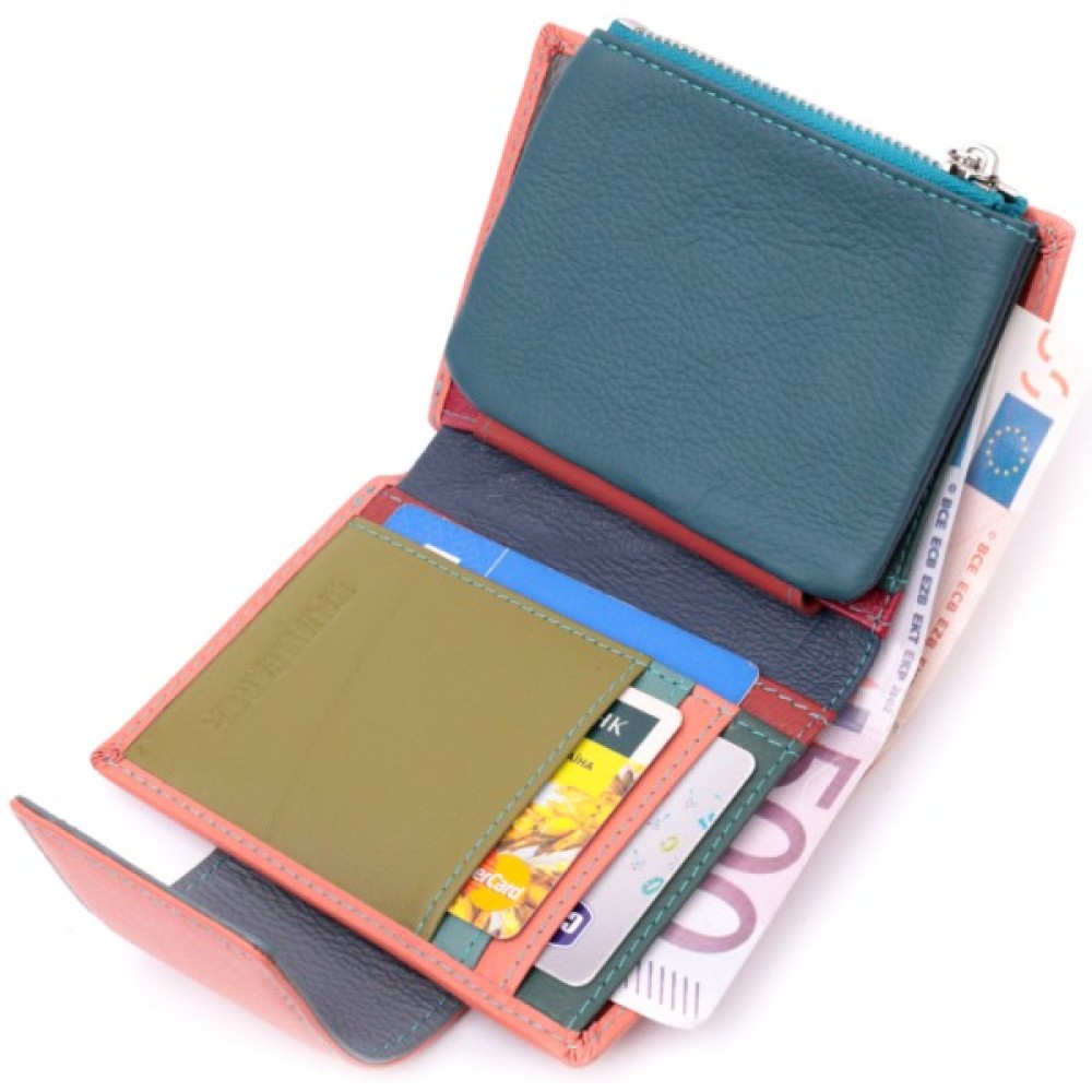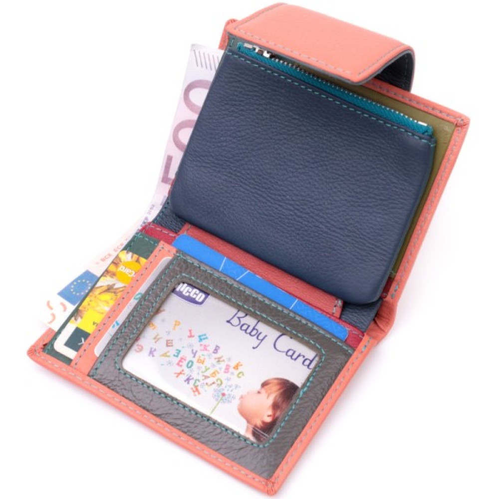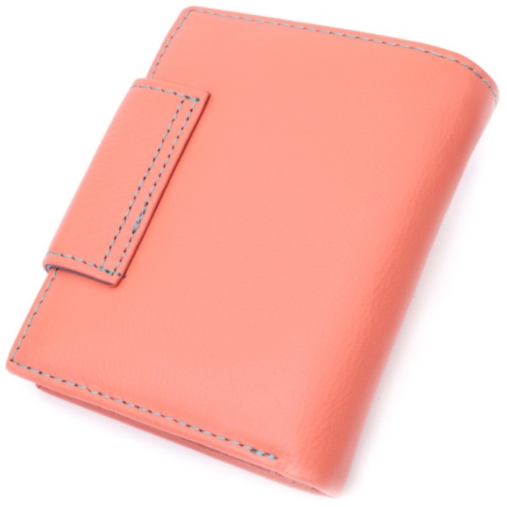 Вертикальне портмоне в два складання зручного розміру з натуральної шкіри найвищої якості. Гаманець помаранчевого кольору з кораловим відтінком ззовні та різнобарвний всередині, що дуже стильно і сучасно. Шкіряне портмоне дуже практичне і служить досить довго. Аксесуар складається з основного відділення зі шкіряною перегородкою для купюр, монетниці, чотирьох осередків для карт, прозорого віконця для пропуску та чотирьох прихованих кишень. Портмоне доповнене надійною фурнітурою і прошито по краю рівним рядком бірюзового кольору. Виріб стане ідеальним подарунком для дівчини будь-якого віку.
