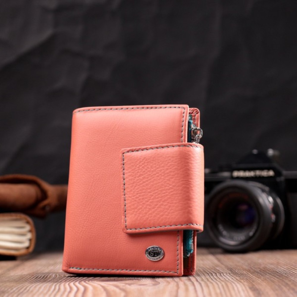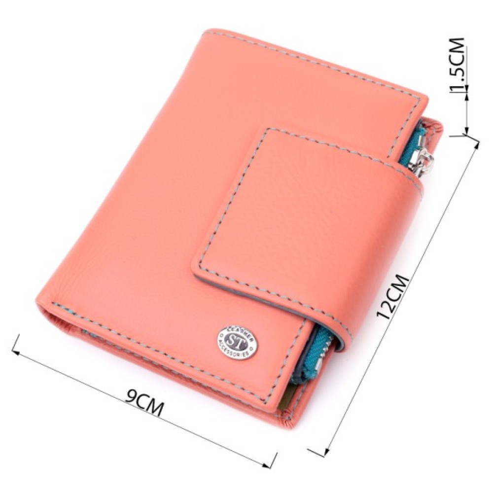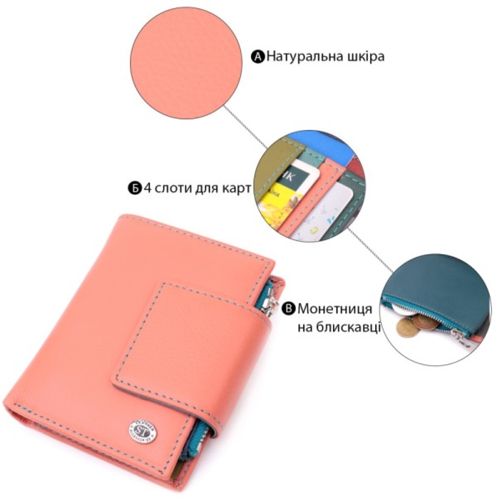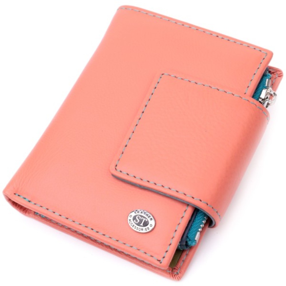 Вертикальне портмоне в два складання зручного розміру з натуральної шкіри найвищої якості. Гаманець помаранчевого кольору з кораловим відтінком ззовні та різнобарвний всередині, що дуже стильно і сучасно. Шкіряне портмоне дуже практичне і служить досить довго. Аксесуар складається з основного відділення зі шкіряною перегородкою для купюр, монетниці, чотирьох осередків для карт, прозорого віконця для пропуску та чотирьох прихованих кишень. Портмоне доповнене надійною фурнітурою і прошито по краю рівним рядком бірюзового кольору. Виріб стане ідеальним подарунком для дівчини будь-якого віку.