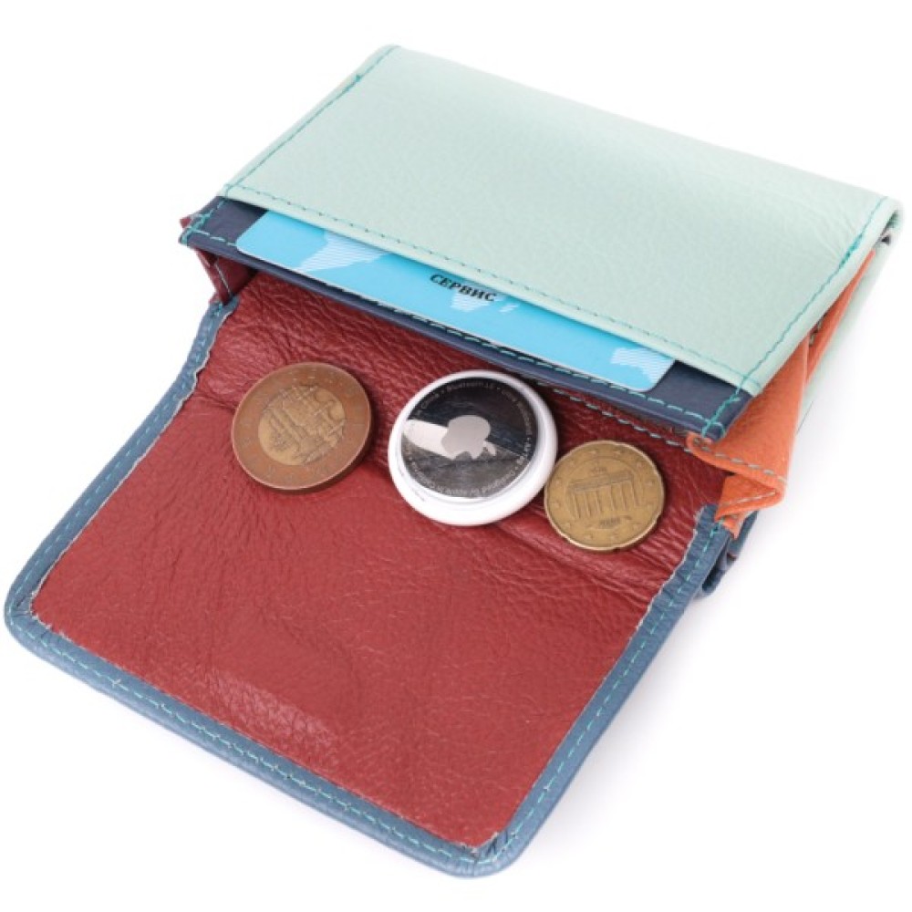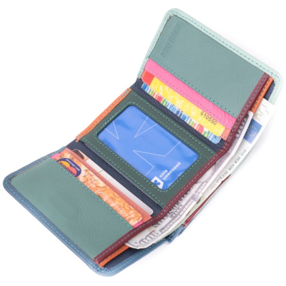 Місткий жіночий гаманець середнього розміру із натуральної шкіри. Відмінною рисою цієї моделі є двокольорова зовнішня частина та багатобарвна внутрішня частина.