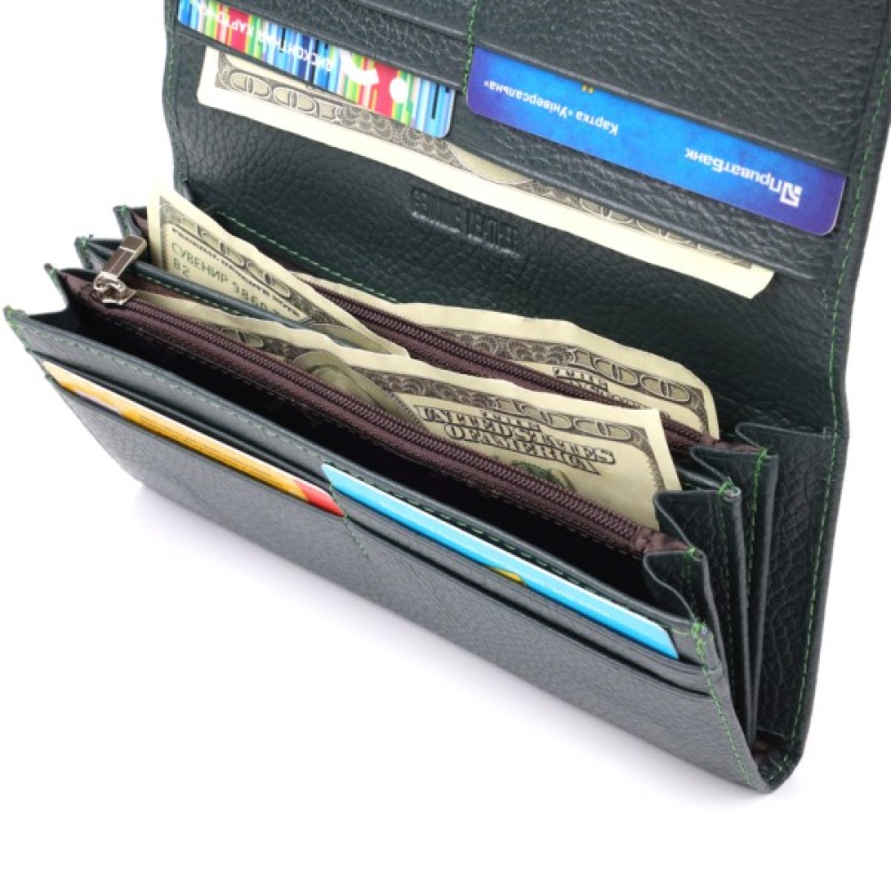 Усередині — чотири відділення для купюр, дві кишені на блискавці, вісім осередків для карток, а також два приховані відділення.