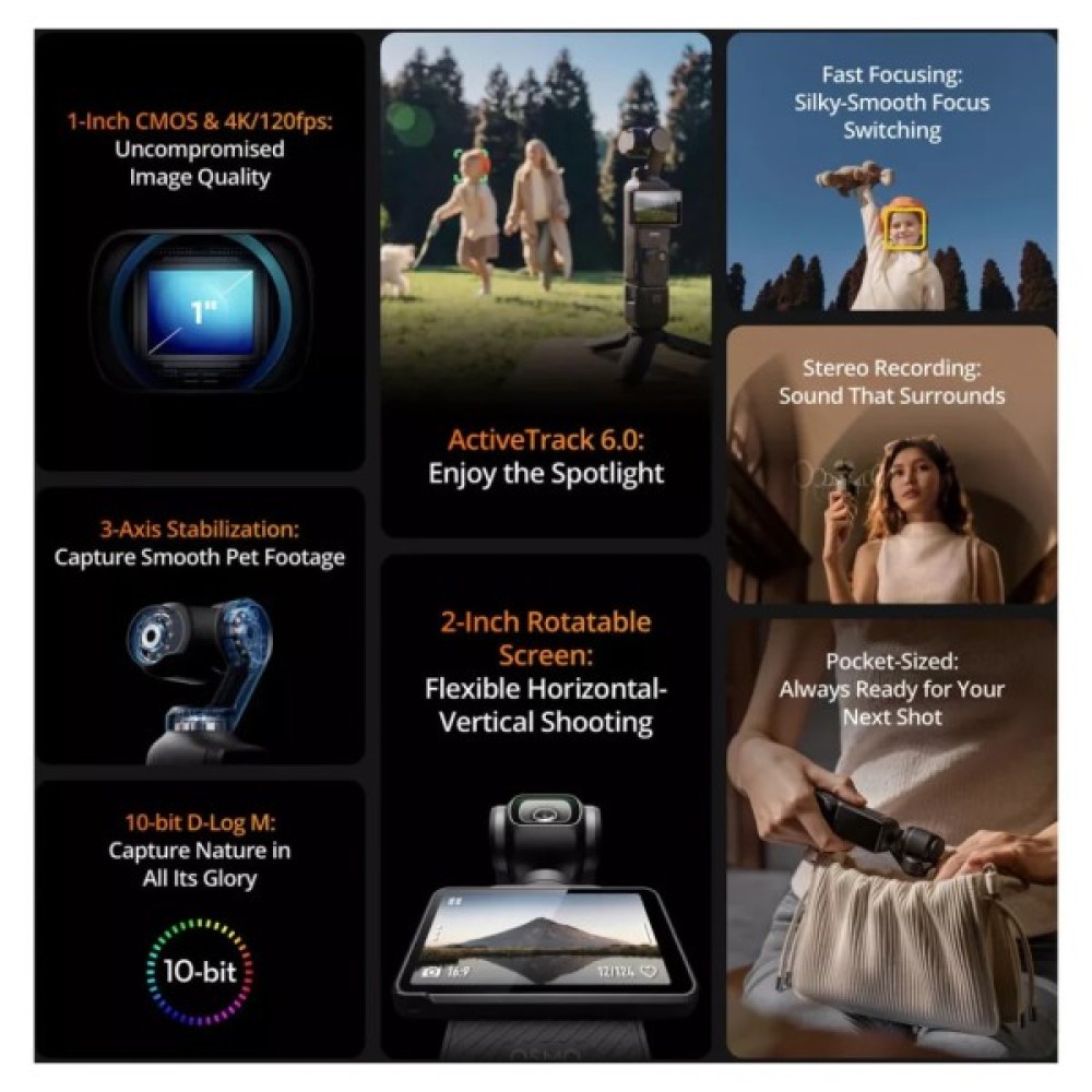 DJI Osmo Pocket 3 — це ключ до створення дивовижних історій у якості 4K/120FPS, де 1-дюймова CMOS-матриця перенесе вас у світ дивовижних деталей і ефектів сповільненої зйомки. Glamour Effects 2.0 прикрасить ваші знімки та підкреслить їх унікальність. Будьте вражені режимами 10-бітного кольору D-Log M і 10-бітного HLG, які передають справжню красу моментів, навіть під час заходу сонця. Але це ще не все! Звукозапис на найвищому рівні? 3-мікрофонна система гарантує ідеальний звук, зменшує шум і точно визначає джерела звуку навіть у людних місцях. А якщо вам потрібно підключити зовнішній мікрофон або навушники, у вашому розпорядженні протокол USB Audio.