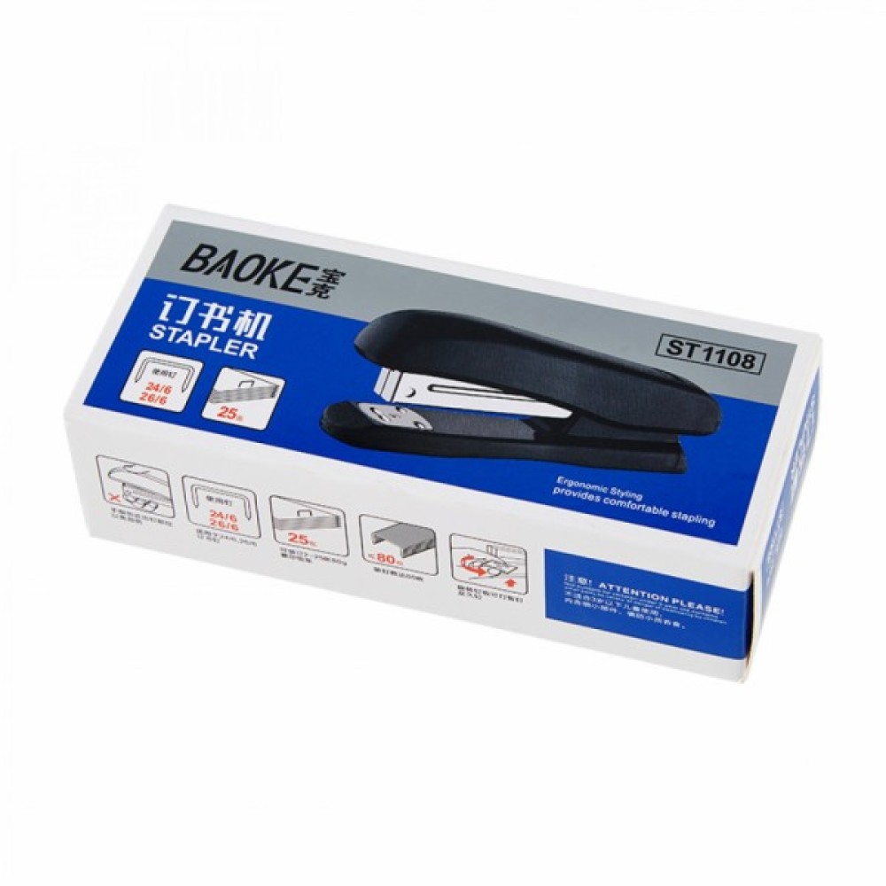 Пластиковий степлер ТМ Baoke допоможе легко, майже без зусиль, скріпити до 25 аркушів паперу щільністю 80 г. Класичний пластиковий корпус з ергономічним дизайном робить використання степлеру ще більш зручним та легким, та дозволяє використовувати його як в офісі, так и вдома. Фактура підошви степлеру перешкоджає його ковзанню по поверхні.