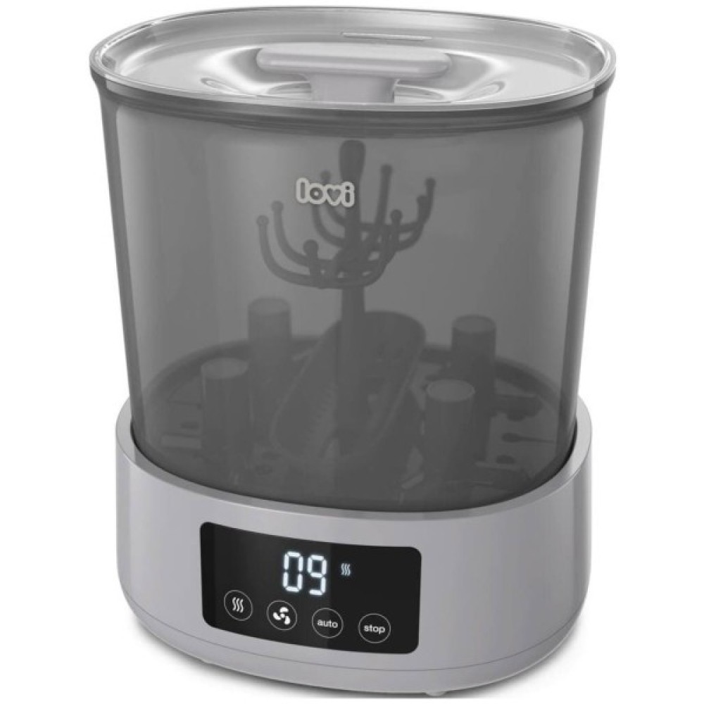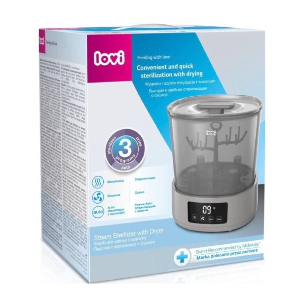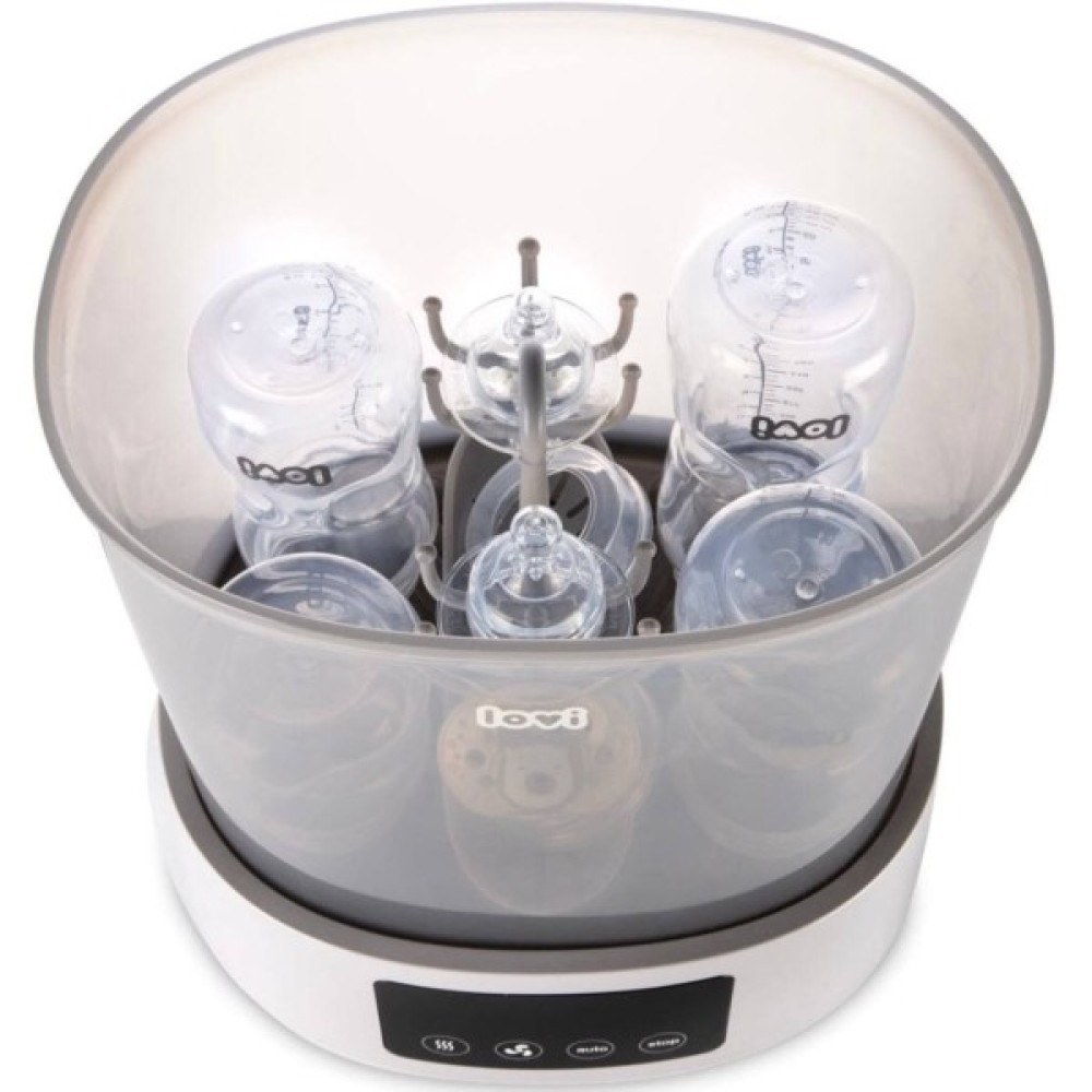 Стерилізатор електричний паровий із сушаркою від бренда LOVI — інноваційне поєднання двох функцій, завдяки чому пляшечки та соски швидко чисті та сухі.