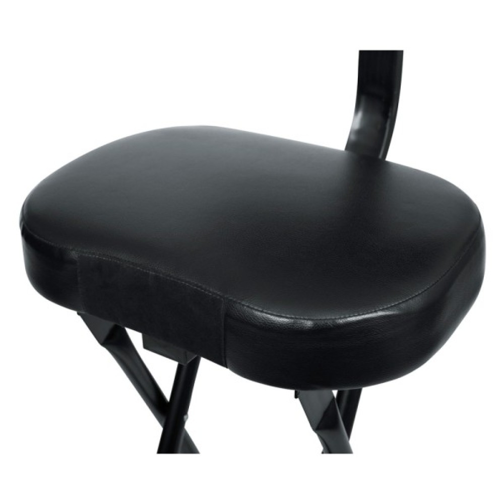 Зручне сидіння з товстою підкладкою гарантує комфорт навіть під час довгих виступів, а м'яка вставка з мікрозамші на передній частині надійно утримує гриф гітари, не залишаючи на ньому подряпин та потертостей. Ергономічна спинка надійно підтримує музиканта під час виступу. Якщо ж ви звикли до стандартних стільчиків або віддаєте перевагу більшій свободі і відриву, то можете легко і швидко зняти її.