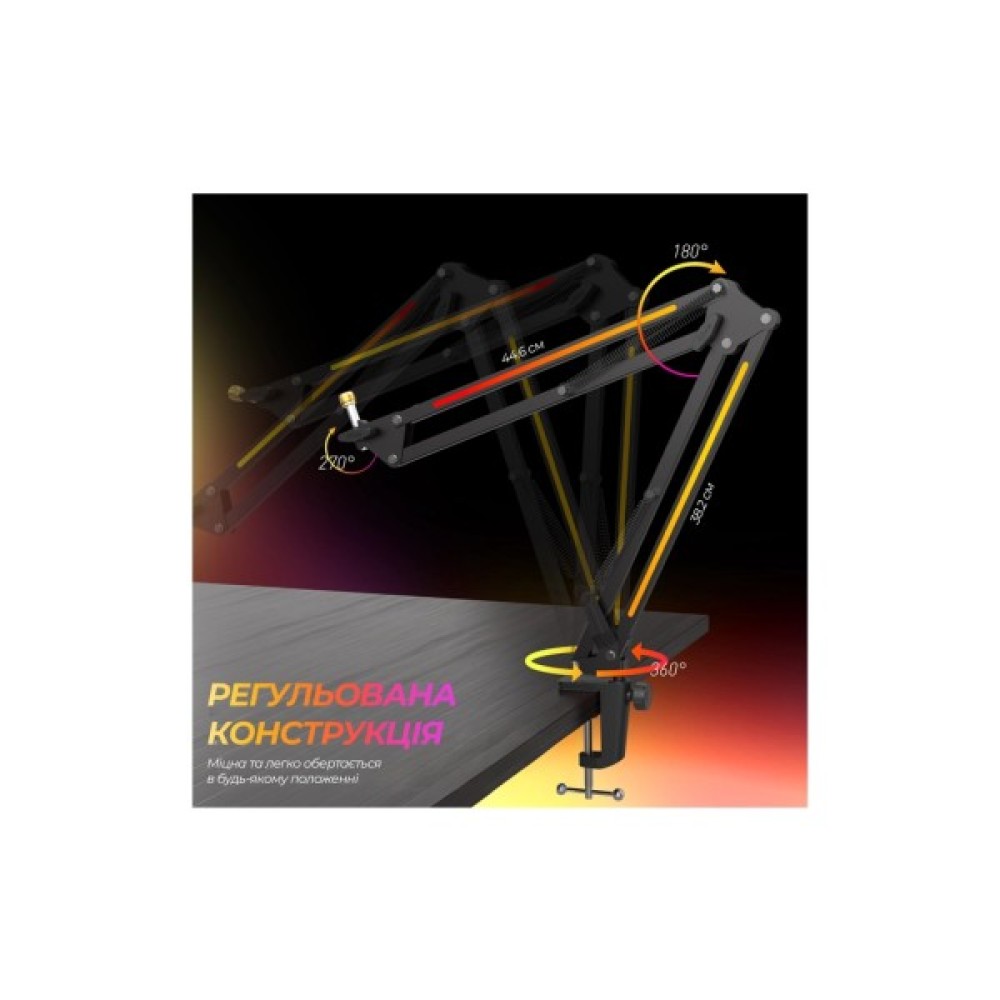 • Підходить для мікрофонів із стандартом кріплення 5/8" та 3/8". - Комбінований роз'єм Type-C + USB-A для живлення підсвічування забезпечує підключення до ПК, ноутбука.