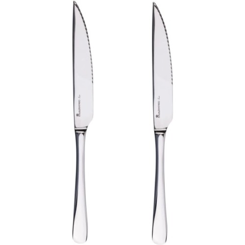 Леза ножів мають оптимальну довжину, що ідеально підходить для нарізки м'яса, забезпечуючи точність та комфорт. Ергономічні ручки з нержавіючої сталі гарантують надійне утримання та зручність у використанні. Стильний дизайн у чорному та металевому кольорах чудово доповнить будь-який стіл.