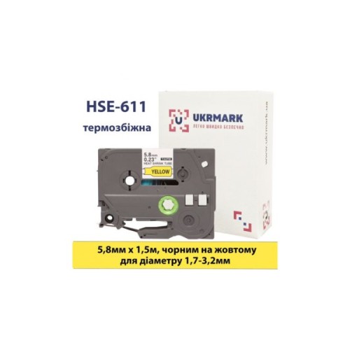 Стрічка для принтера етикеток UKRMARK B-Hs611, аналог HSe611, термозбіжна, 1,7-3,2мм, 5,8мм х 1,5м, black on yellow (900409)
