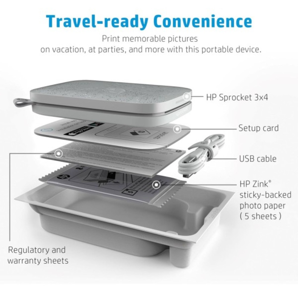 Фотопринтер HP Sprocket працює на основі інноваційної технології повнокольорового термодруку ZINK®, тому не потребує для роботи чорнильних картриджів. Використовуйте для друку фотопапір Sprocket Zink 3.5"x4.25" та роздруковуйте фотографії з максимальним розміром 3.5"x 4.25".
