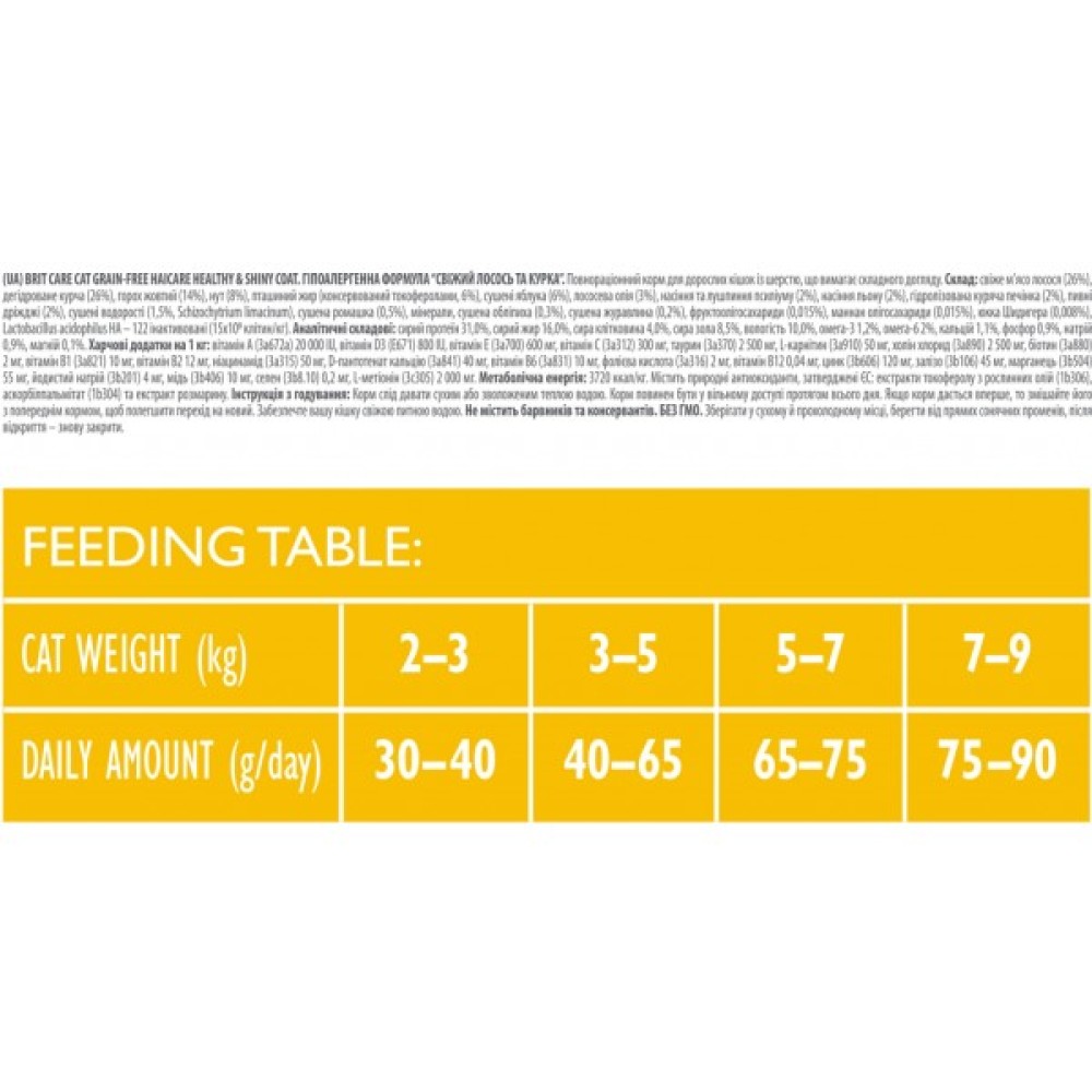 Цей корм також містить клітковину для легкого виведення шерстяних грудочок, а пробіотики в покращують травлення та зміцнюють імунну систему. Олія лосося, насіння льону та водорості служать додатковими джерелами корисних елементів, що підтримують гармонійний розвиток.
