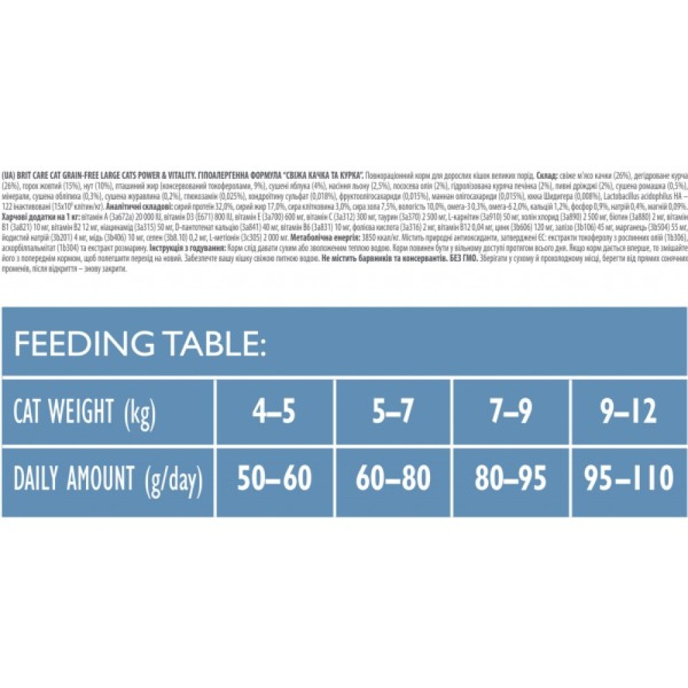 Основою продукту стали натуральні інгредієнти — качка та курка, які насичують організм тварини якісним білком, необхідним для підтримки життєвої енергії та сили. Беззернова рецептура робить корм ідеальним для чутливих кішок, сприяючи легкому засвоєнню та запобіганню травних проблем.