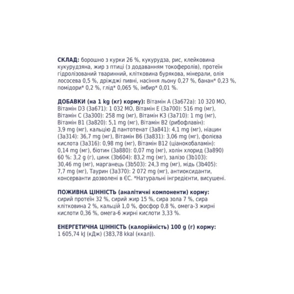 Основним інгредієнтом корму є м'ясо курки, яке в поєднанні з кукурудзою та рисом формує збалансовану формулу 32/15 для оптимального харчування. Корм містить 26% борошна з курки, що має високий коефіцієнт перетравності, завдяки чому ваш улюбленець отримує максимальну користь з кожного шматочка.