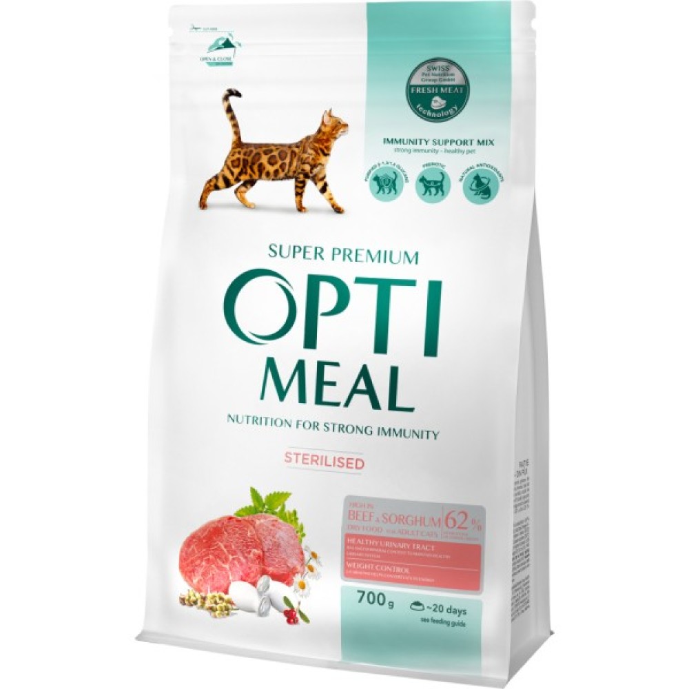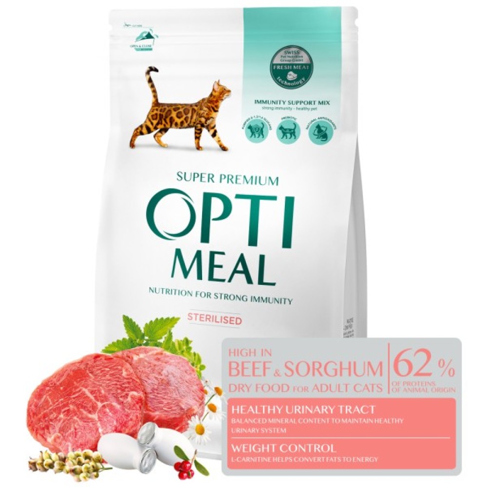 Сухий корм для кішок Optimeal, ідеально пристосований для потреб стерилізованих та кастрованих домашніх улюбленців, є поєднанням смаку та поживних властивостей, що підтримують здоров'я вашого кота. Цей суперпреміум клас продукт з високим вмістом яловичини підкреслює виняткову якість раціону, створюючи міцний фундамент для повсякденного харчування вашого улюбленця.