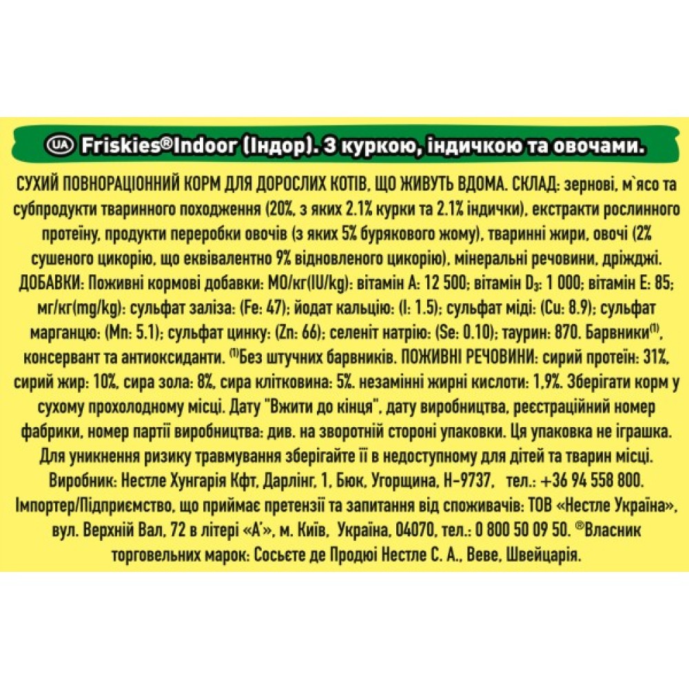 Вироблений в Угорщині, цей корм підходить для кішок всіх порід, починаючи з 12 місяців. Він містить всі необхідні вітаміни та мінерали для підтримки здоров'я та життєвої активності вашого улюбленця. Збагачений білками (35%) і жирами (12%), корм надає 354 kcal/100 г, що є оптимальною енергетичною цінністю для домашніх пухнастиків. Вибирайте Purina Friskies Indoor і насолоджуйтеся здоров'ям та грайливістю вашого домашнього улюбленця щодня!