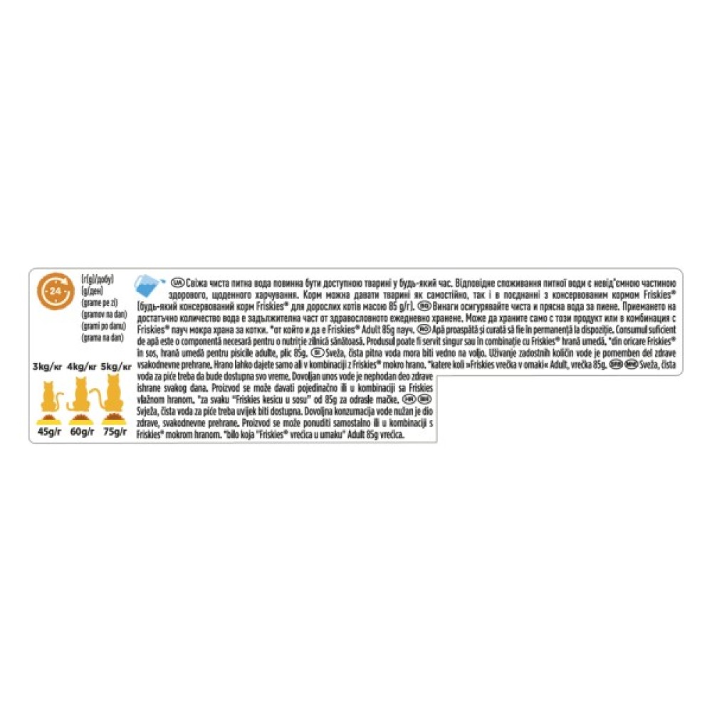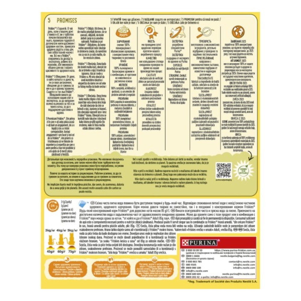 Ваш кіт унікальний, він додає вашому будинку неповторності та наповнює радістю ваше життя. Friskies забезпечує його улюбленою їжею, яку він так потребує, щоб і далі дивувати вас і тішити щодня. З кожним продуктом Friskies ми зобов'язуємося надати вам асортимент смачних продуктів, які завжди будуть подобається вашому котові. 100% повнораціонне та збалансоване харчування, що містить в собі високоякісні білки, жирні кислоти, вітаміни та мінерали для підтримки здорового, щасливого й активного життя вашого улюбленця. Корм розроблений експертами компанії Рurina з досвідом роботи у сфеpі харчування домaшніх тварин понад 85 років. З Friskies ваш кіт робить ваш будинок домом.