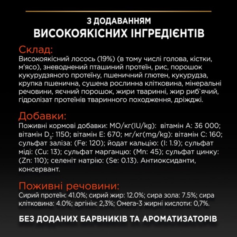 Основний інгредієнт – лосось, що входить до складу на 19%, забезпечує високий вміст білка (41%) і низький вміст жиру, допомагаючи підтримувати здорову вагу тіла і сильну мускулатуру. Збалансоване поєднання вітамінів А, С, Е та незамінних жирних кислот Омега-3 й Омега-6 підтримає шкірний покрив і блискучість шерсті. Унікальна формула OPTISENSES спеціально розроблена для покращення роботи органів чуття вашого котика.