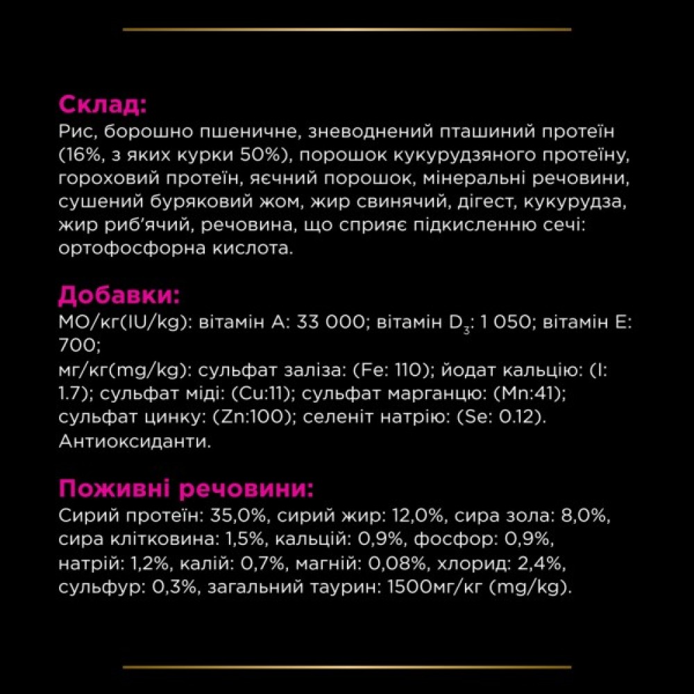Формула включає комплекс St/Ox, який знижує ризик утворення як струвітних, так і оксалатних каменів, забезпечуючи здоров'я нирок вашої кішки. Корм має помірну калорійність, що допомагає підтримувати оптимальну масу тіла улюбленця, включає важливі вітаміни (A, D3, E) та мінерали (цинк, залізо) для загального здоров'я.
