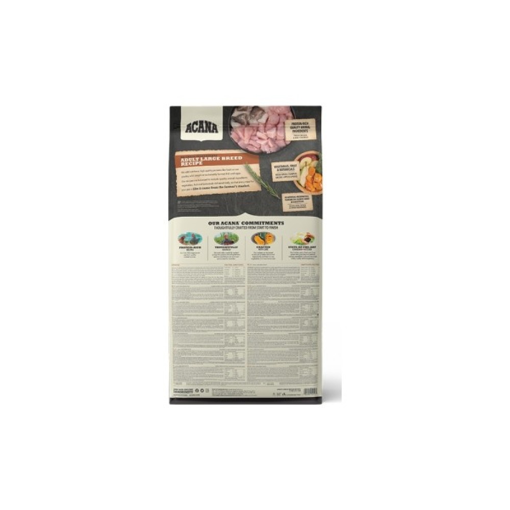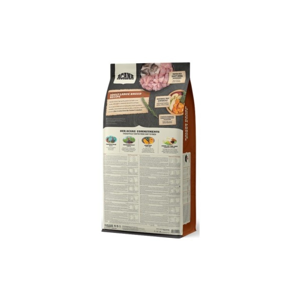 Енергетична цінність продукту становить 3375 ккал/кг, що робить його ідеальним джерелом енергії для активних собак, вагою більше 25 кг. Завдяки ACANA Adult Large Breed Recipe ваш чотирилапий друг отримає не лише всі необхідні поживні речовини, а й задоволення від чудового смаку, забезпечуючи при цьому довге і щасливе життя. Обирайте надійну якість з Канади для вашого улюбленця!