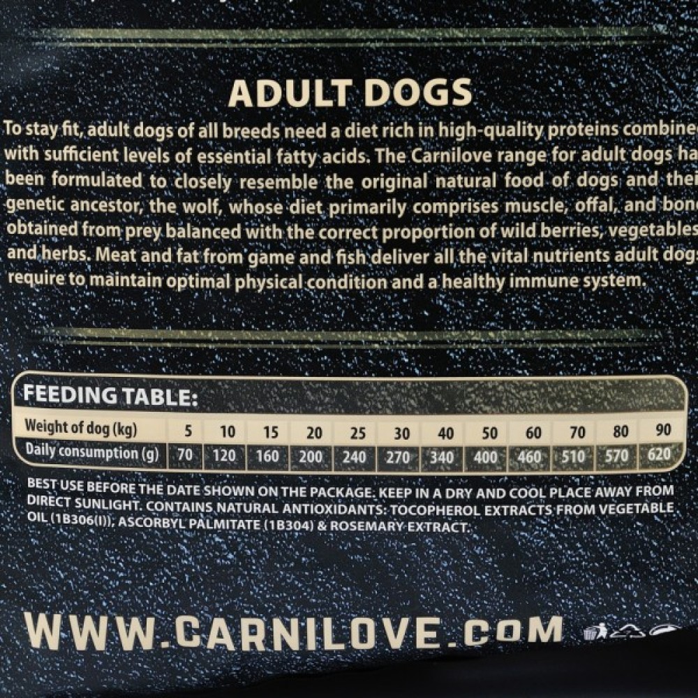 Упакований у зручний мішок вагою 12 кг, цей корм стає економічно вигідним рішенням для щоденного годування. Обираючи Carnilove, ви отримуєте якість, яка відповідає найвищим стандартам, та впевненість у тому, що ваш пес отримує все необхідне для здорового та енергійного життя.