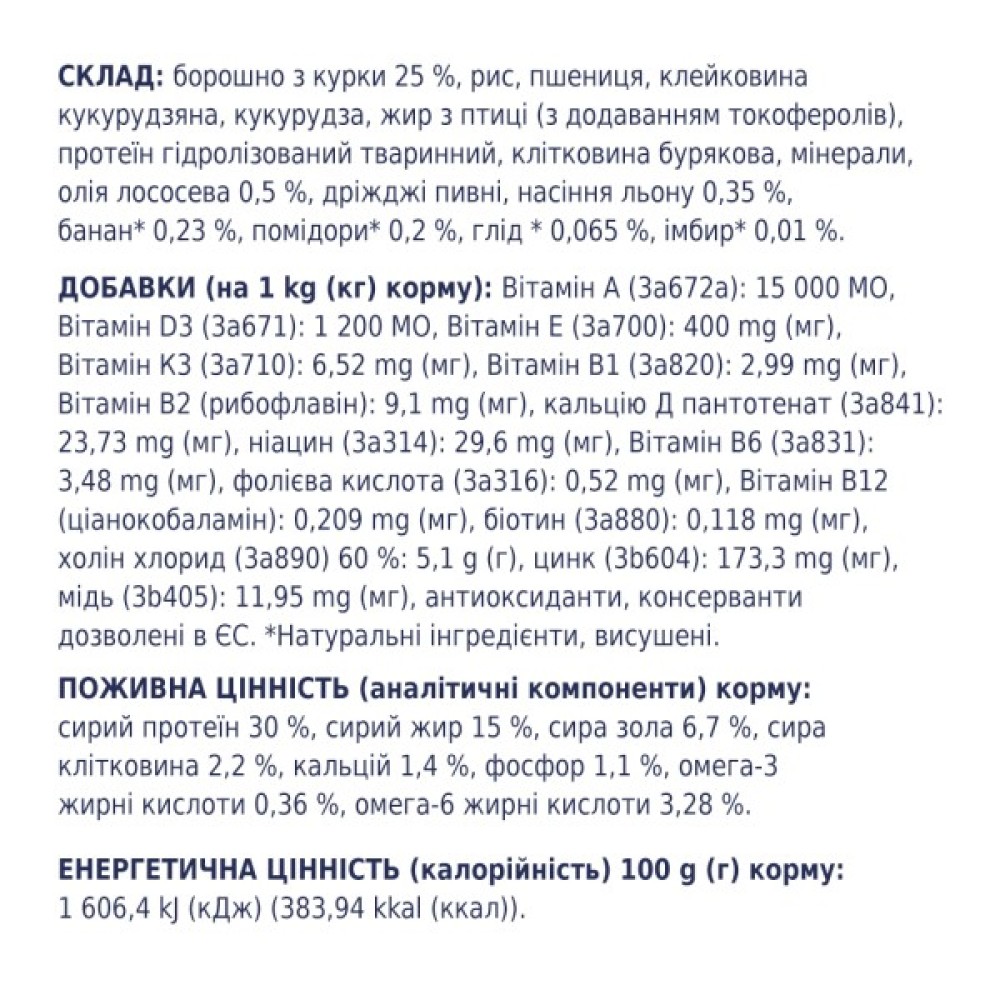 Склад: борошно з курки 25 %, рис, пшениця, клейковина кукурудзяна, кукурудза, жир з птиці (з додаванням токоферолів), протеїн гідролізований тваринний, бурякова, мінерали, олія лососева 0,5 %, дріжджі пивні, насіння льону 0,35 %, банан 0,23 %, помідори 0,2 %, глід 0,065 %, імбир 0,01 %.