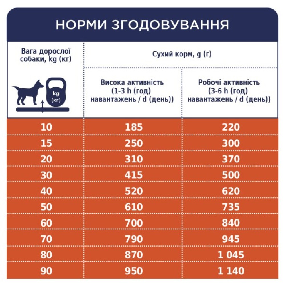 Сухий раціон Club 4 Paws містить м’ясні інгредієнти на першому місці у складі, високий вміст білків 30% та жирів 15% для високої енергетичні потреби активних та спортивних собак усіх порід віком від 1 року. Раціон збагачений комплексом Омега 3 + Омега 6 для здорової шкіри та блискучої шерсті, а також формулою INTEGRAMIX для загальної підтримки здоров'я вашого улюбленця.