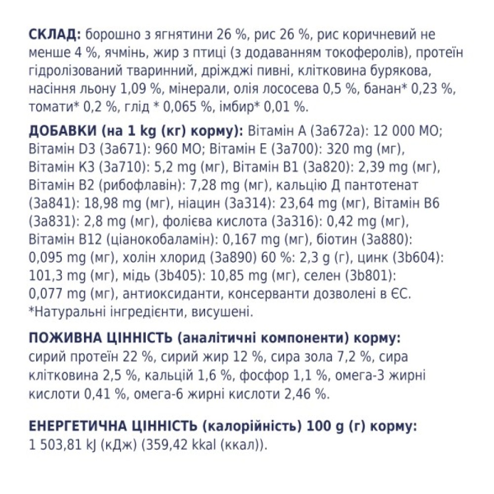 Гарантовані показники: сирий протеїн — 22%, сирий жир — 12%, сирий попіл — 7,2%, сира клітковина — 2,5%, кальцій — 1,6%, фосфор — 1,1%, омега-3 жирні кислоти — 0,41%, омега-6 жирні кислоти — 2,46%.