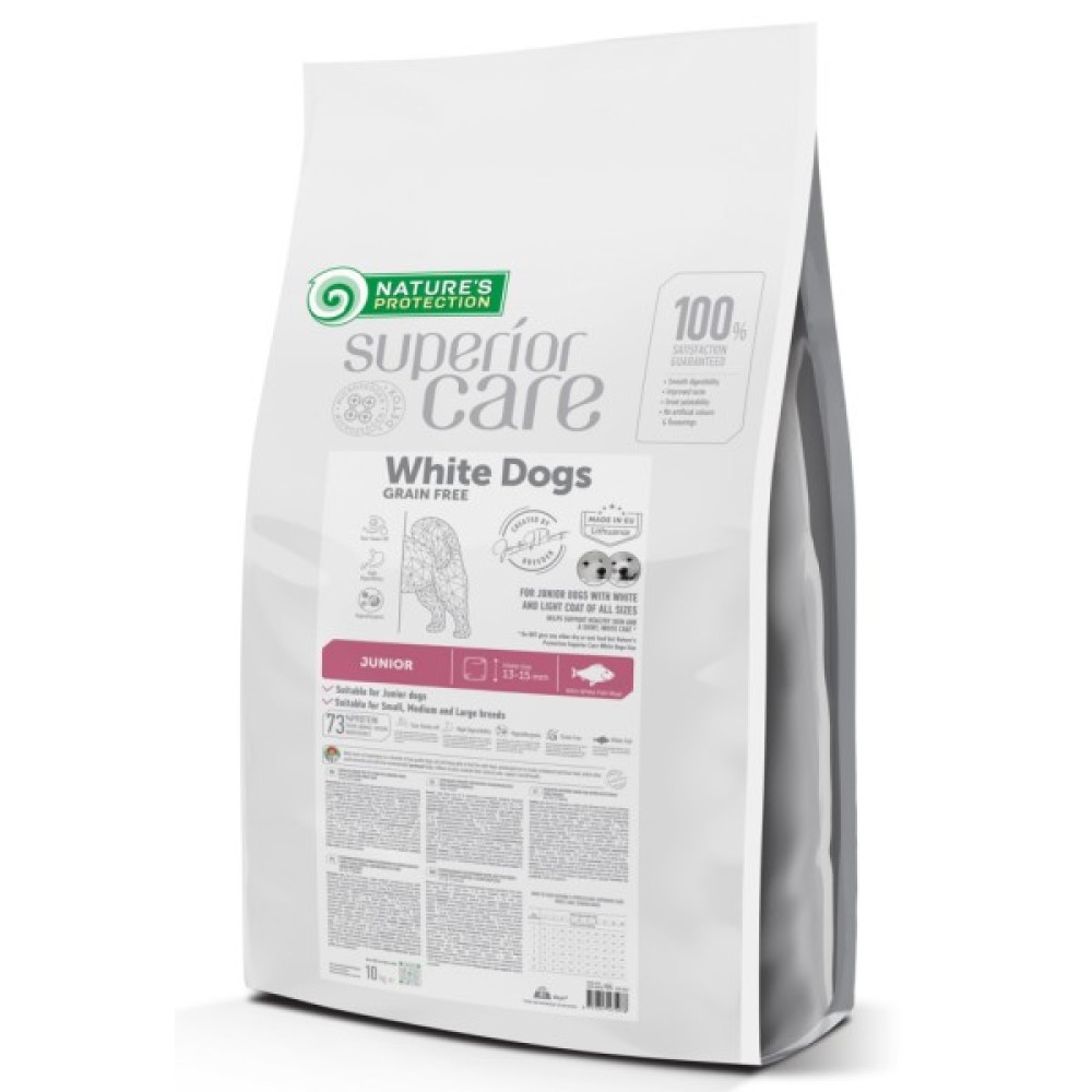 Сухий корм для собак Nature's Protection Superior Care White Dogs Grain Free White Fish Junior All Sizes 17 кг (NPSC47646) – це унікальний продукт, спеціально розроблений для догляду за білошерстими і світлошерстими цуценятами та юніорами. Призначений для активних собак, цей корм поєднує в собі всі необхідні компоненти для забезпечення здорового росту й розвитку вашого улюбленця. Виготовлений у Литві, продукт належить до класу суперпреміум і підходить для собак усіх розмірів.