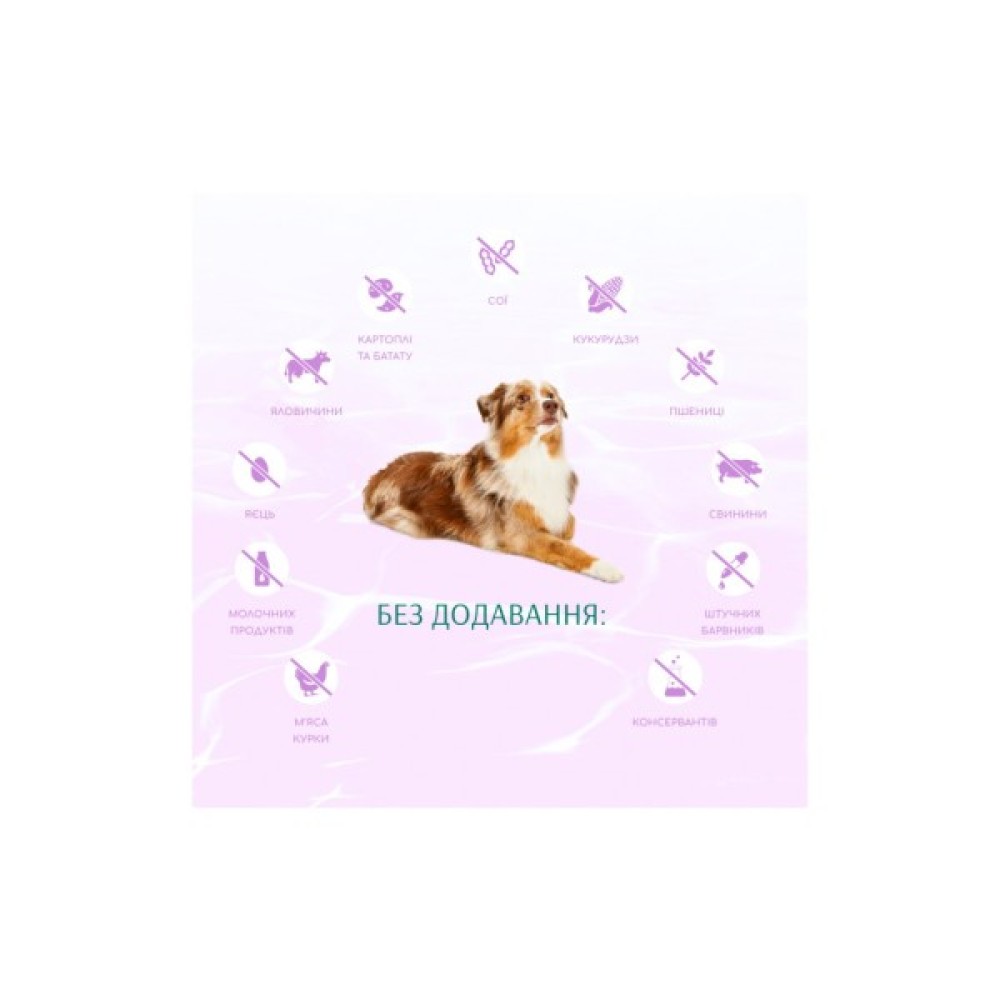 Склад відзначається високою харчовою цінністю: на 100 г продукту припадає 29 г білка і 17 г жиру, тому він ідеально підтримує оптимальну вагу та енергійність собаки. Важливою особливістю є відсутність зернових, що особливо підходить для собак з чутливим шлунково-кишковим трактом.