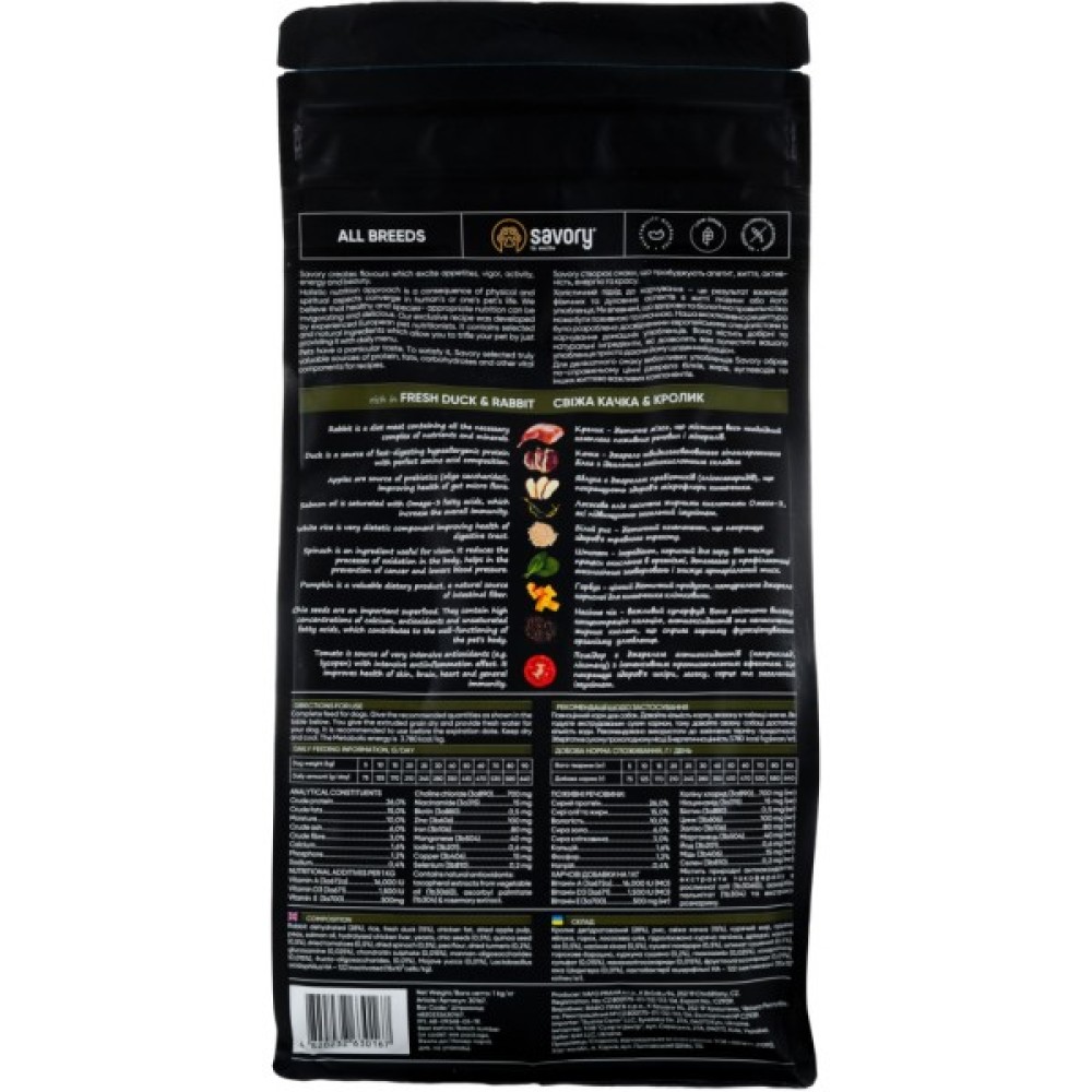Сухий корм для собак Savory Adult All Breeds rich in Fresh Duck and Rabbit є ідеальним вибором для ваших улюбленців будь-якої породи. Розроблений у Чехії, цей холістичний раціон задовольняє всі потреби дорослих собак у дбайливо підібраній їжі, а також сприяє підтримці їхнього здоров'я.