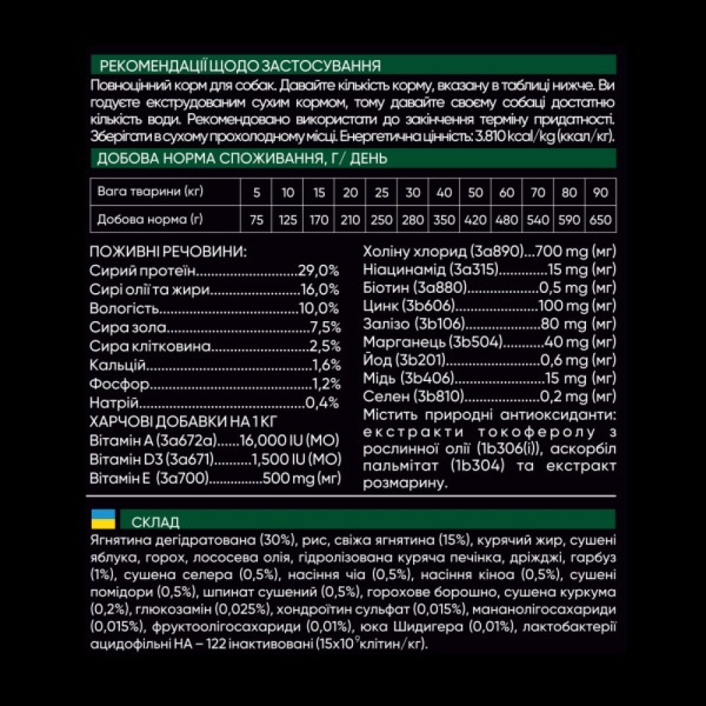 В основі формули — свіже м'ясо ягняти, яке є цінним джерелом легкозасвоюваного білка та відзначається низьким ризиком викликання алергії. Це ідеальний вибір для собак, чутливих до звичних кормів, оскільки він підтримує оптимальний стан здоров'я вашого улюбленця. До складу також входять суперфуди — гарбуз і шпинат, які не тільки покращують травлення, але й сприяють загальному розвитку та життєвій енергії вашого песика.