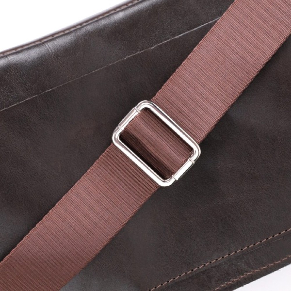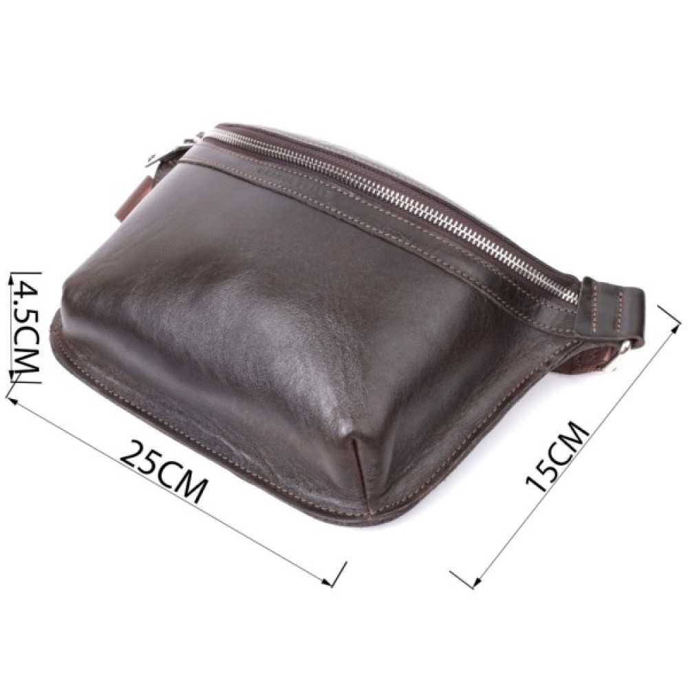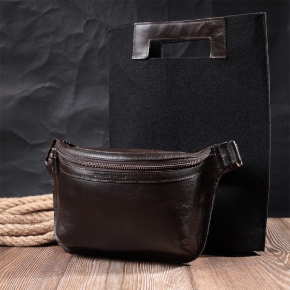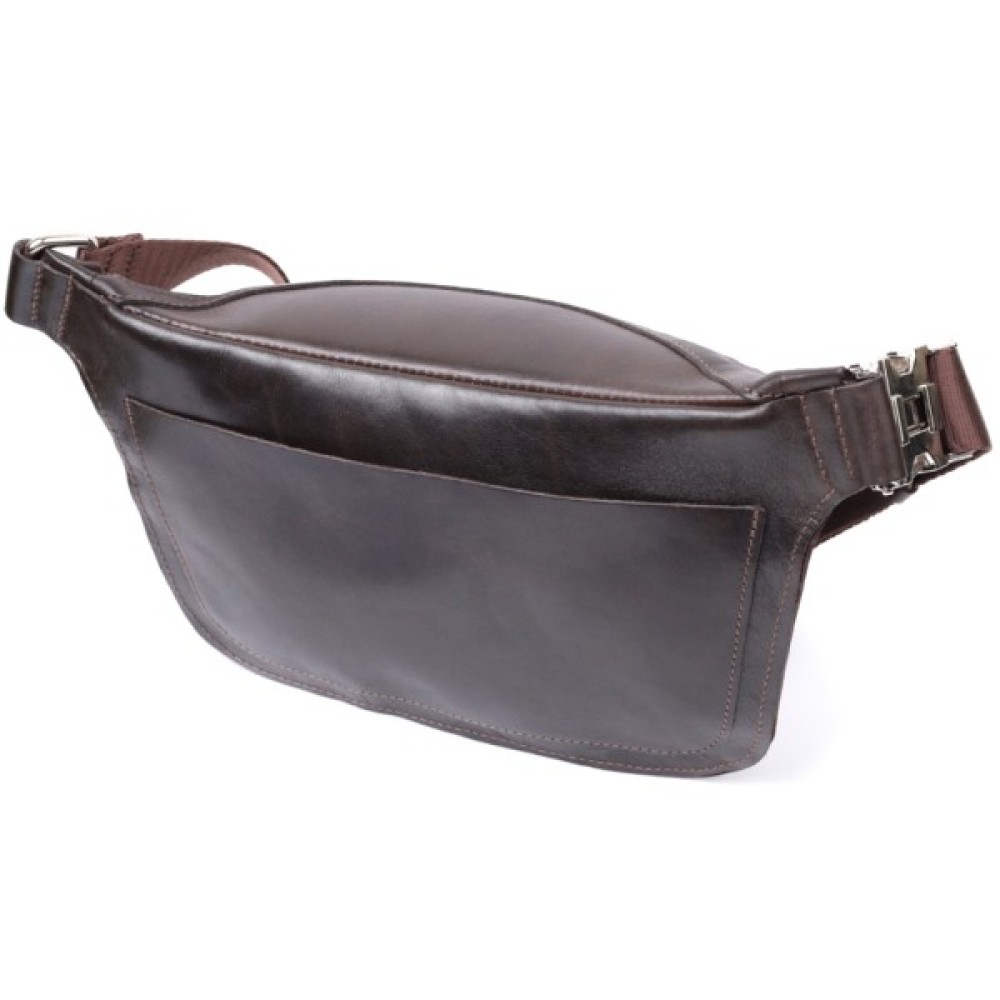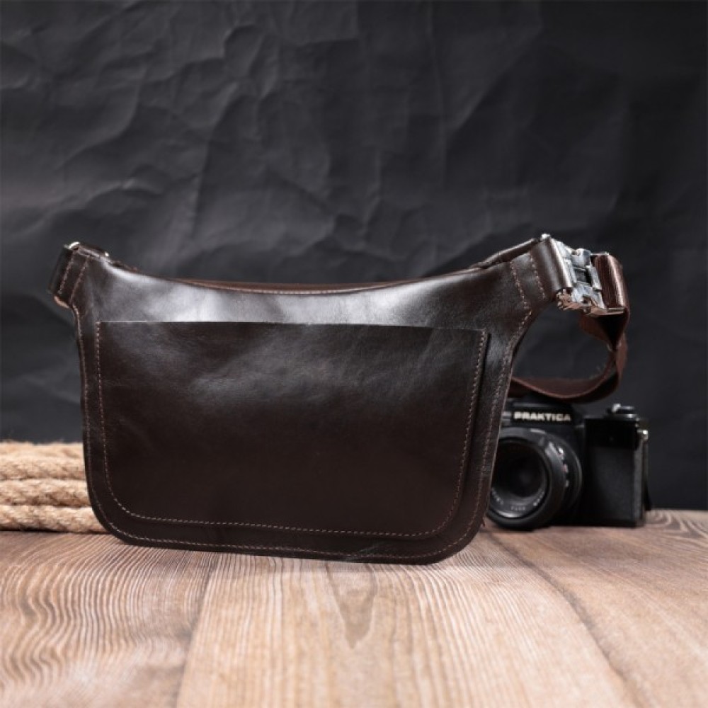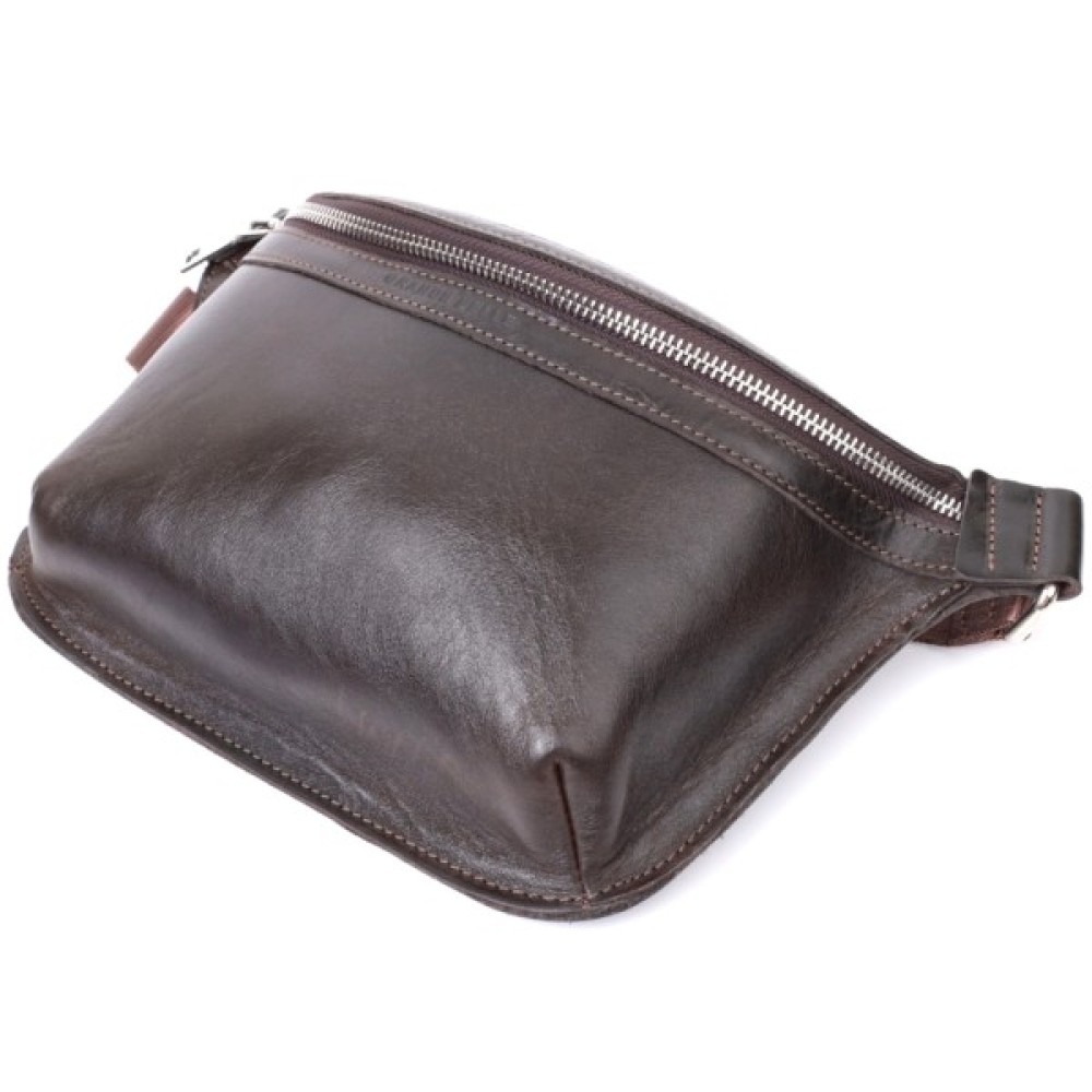 Чоловіча поясна сумка із люксової натуральної шкіри. Складається модель з одного просторого відділення, в якому знаходиться кишеня відкритого типу та кишені на тильній стороні зовні. Вона виглядає дуже сучасно, завдяки красиво підібраній фурнітурі кольору срібла, елегантним рівним рядкам та якісній шкірі, що переливається на сонці.