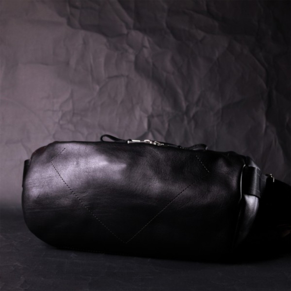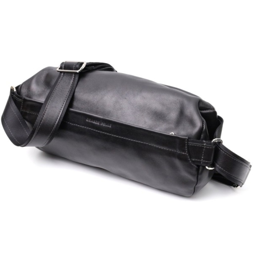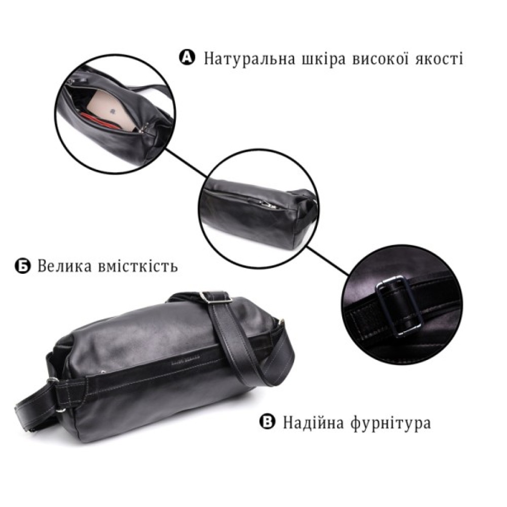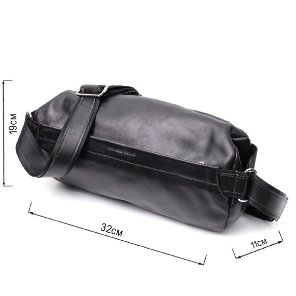 Цікава чоловіча сумка через плече нестандартного дизайну, яка є дуже модною на сьогоднішній день. Виконана з міцної та зносостійкої натуральної шкіри. Колір чорний, фактура гладка та глянсова. Фурнітура срібного кольору, регульований плечовий ремінь у поєднанні надійної ремінної стрічки та натуральної шкіри.