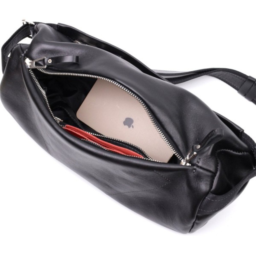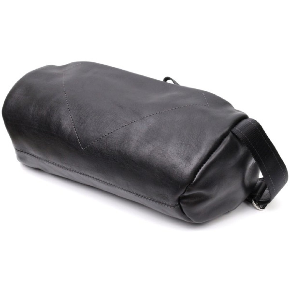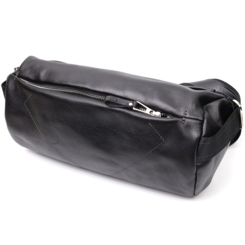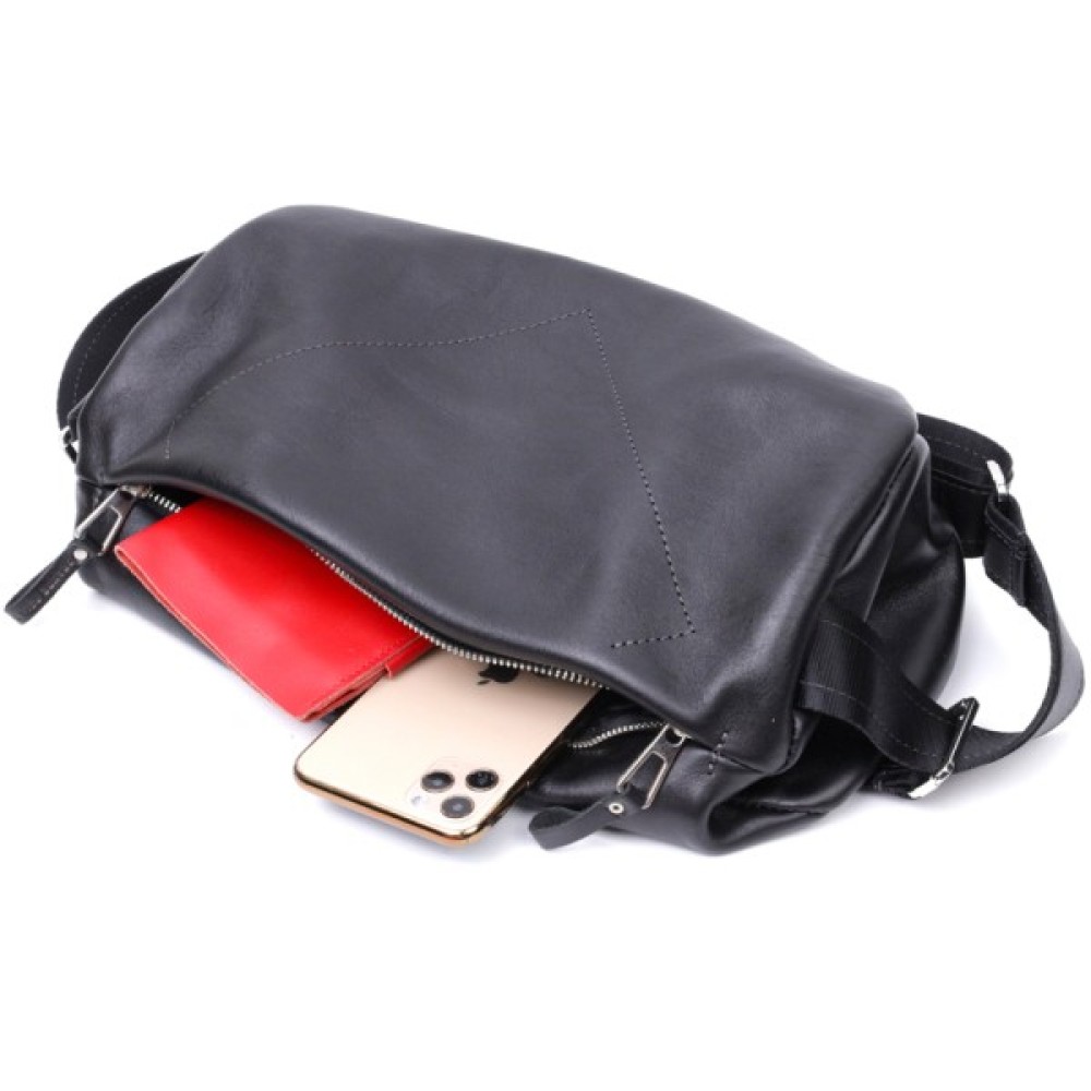 Цікава чоловіча сумка через плече нестандартного дизайну, яка є дуже модною на сьогоднішній день. Виконана з міцної та зносостійкої натуральної шкіри. Колір чорний, фактура гладка та глянсова. Фурнітура срібного кольору, регульований плечовий ремінь у поєднанні надійної ремінної стрічки та натуральної шкіри.