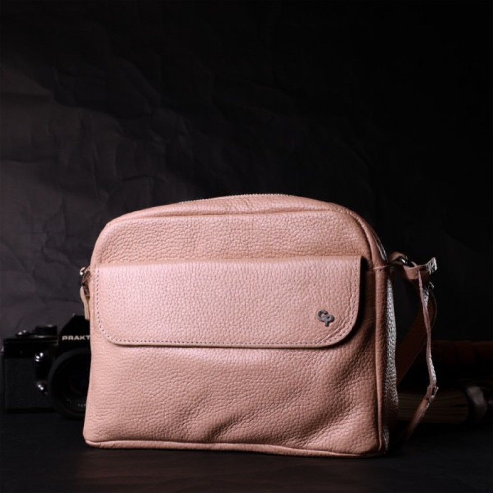 Цікава жіноча сумка через плече – хіт сезону. Аксесуар складається з основного відділення, що закривається на блискавку, кишені відкритого типу та кишені на блискавці всередині, зовнішньої кишені на блискавці, на тильній стороні та накладної кишені на лицьовій стороні, що закривається клапаном на магніти. Виконана з міцної та зносостійкої натуральної шкіри. Фурнітура срібного кольору, регульований шкіряний плечовий ремінь. Упакована ця сумка в гарний фірмовий чохол із ручками.