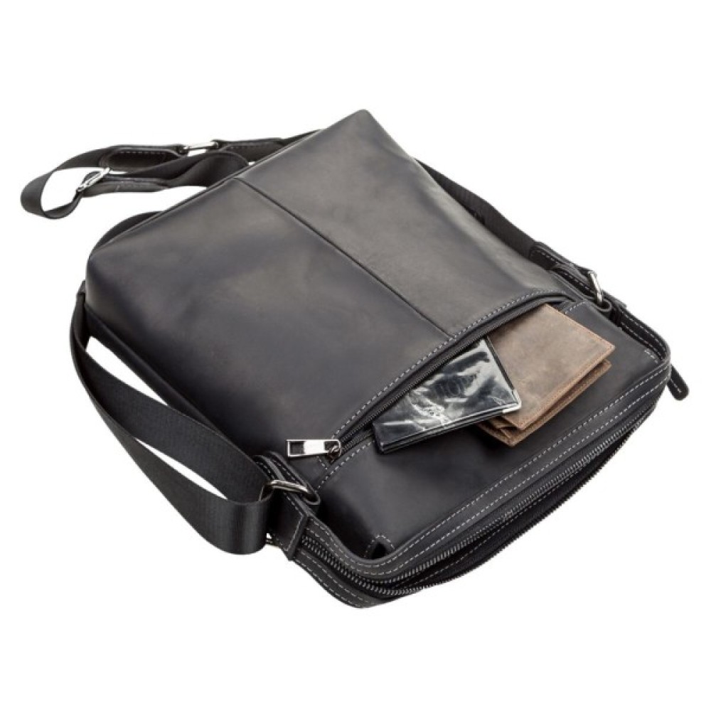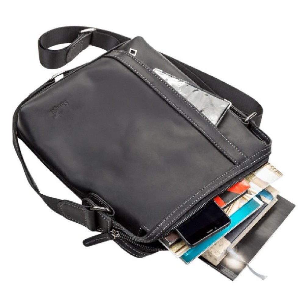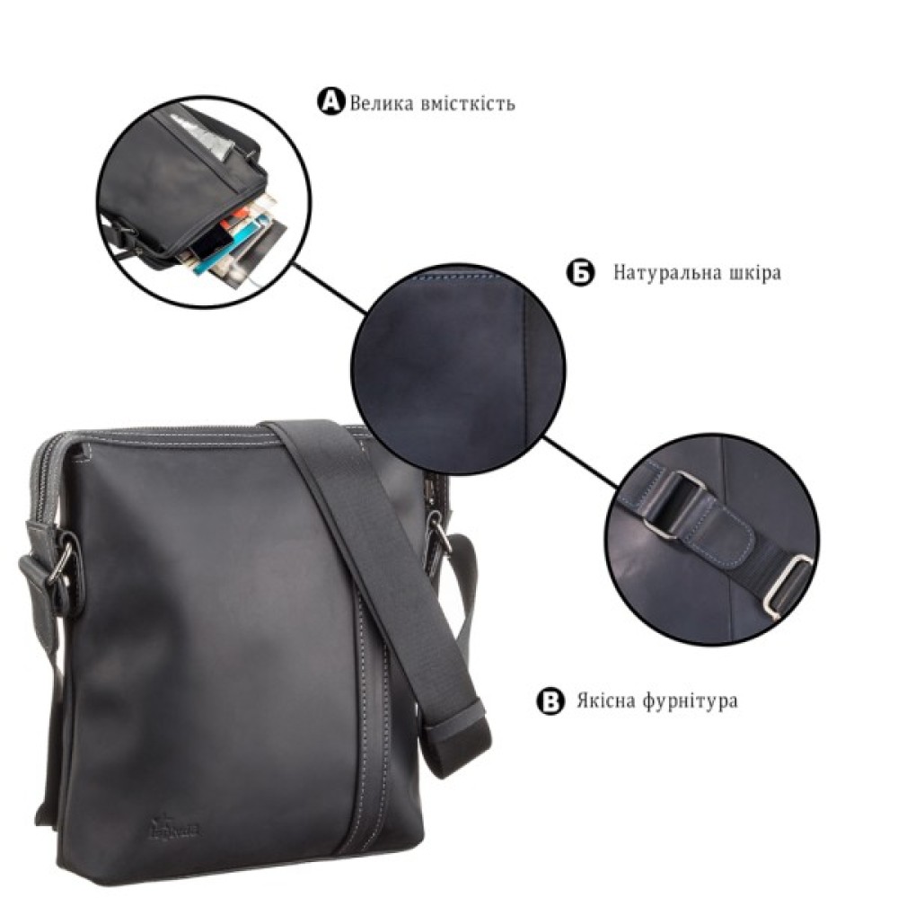 Красива сумка для стильних чоловіків виконана з натуральної вінтажної шкіри, характерними ознаками якої є: неоднорідність забарвлення і потертості, які надають виробу вишуканого, індивідуального вигляду.