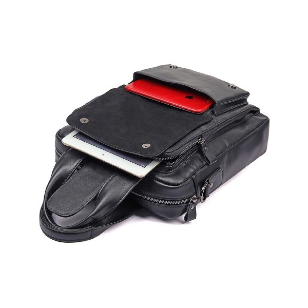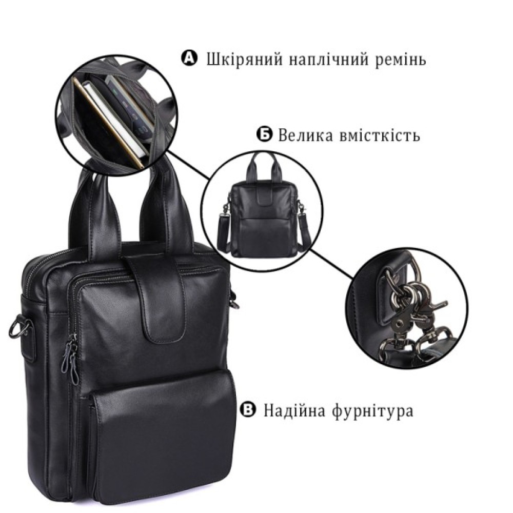 Особливості знімний шкіряний ремінець; потайна кишеня; ручки для перенесення в руках; накладна кишеня на лицьовій стороні; дві накладні кишені на тильній стороні