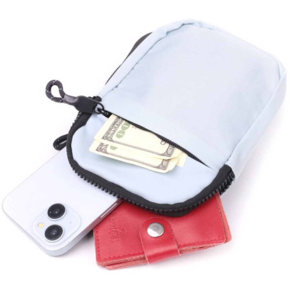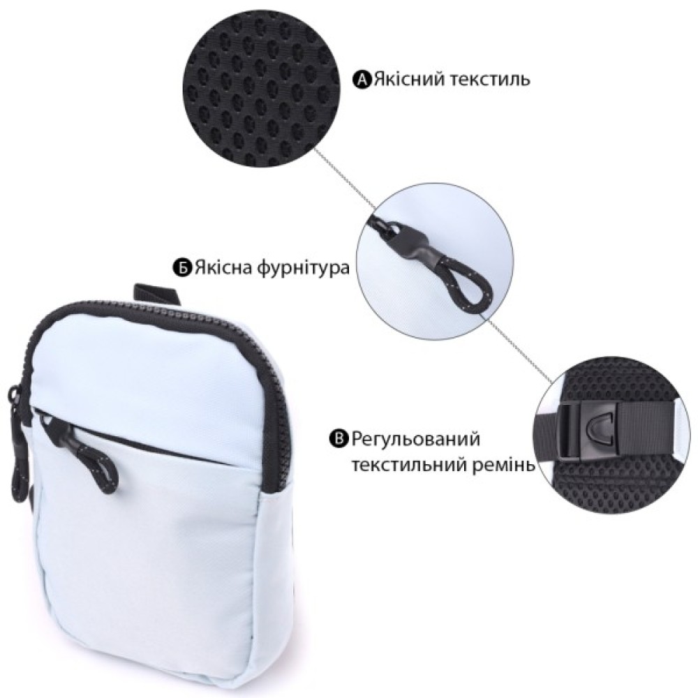 Аксесуар виготовлений з якісного текстилю блакитного кольору, з контрастними вставками чорного кольору, що надає йому ексклюзивного вигляду та стилю. У моделі використано якісну фурнітуру чорного кольору. Сумка легко вміщує паспорт, телефон, ключі, гаманець та ще кілька дрібниць. Якщо Ви шукаєте зручну та легку сумку, яка задовольнить Вас за такими параметрами, як - міцність, практичність, місткість, ексклюзивність, універсальність, то ця модель перед Вами, вона має всі вище перелічені якості та стане одним з Ваших улюблених аксесуарів.