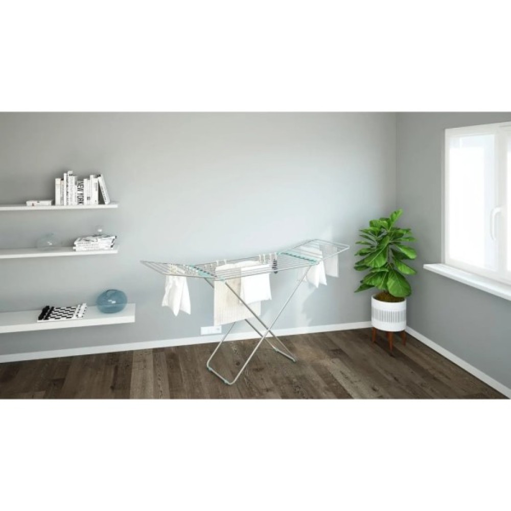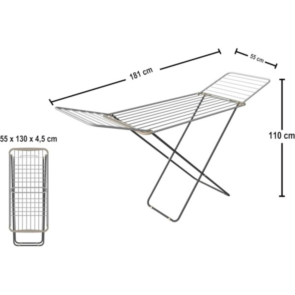 Загальна довжина струн сушарки становить двадцять метрів, що дає змогу одночасно висушити велику кількість білизни. На крайніх струнах відкидних секцій зручно сушити довгу білизну. Максимальне навантаження до дев'яти кілограмів. Підлогова сушарка для білизни проста у використанні та займає мінімум місця в складеному стані.